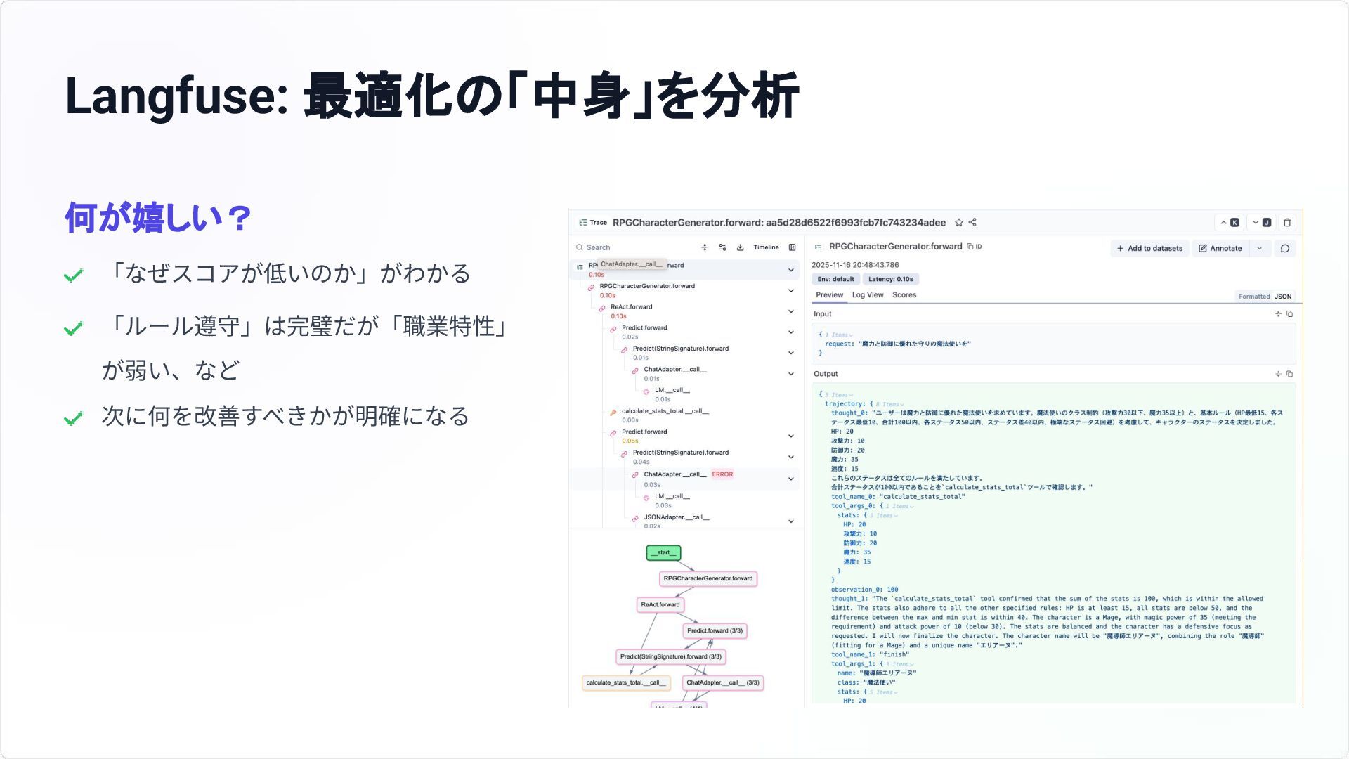 何が嬉しい? 「なぜスコアが低いのか」がわかる 「ルール遵守」は完璧だが「職業特性」 が弱い、など 次に何を改善すべきかが明確になる Langfuse: 最適化の「中身」を分析