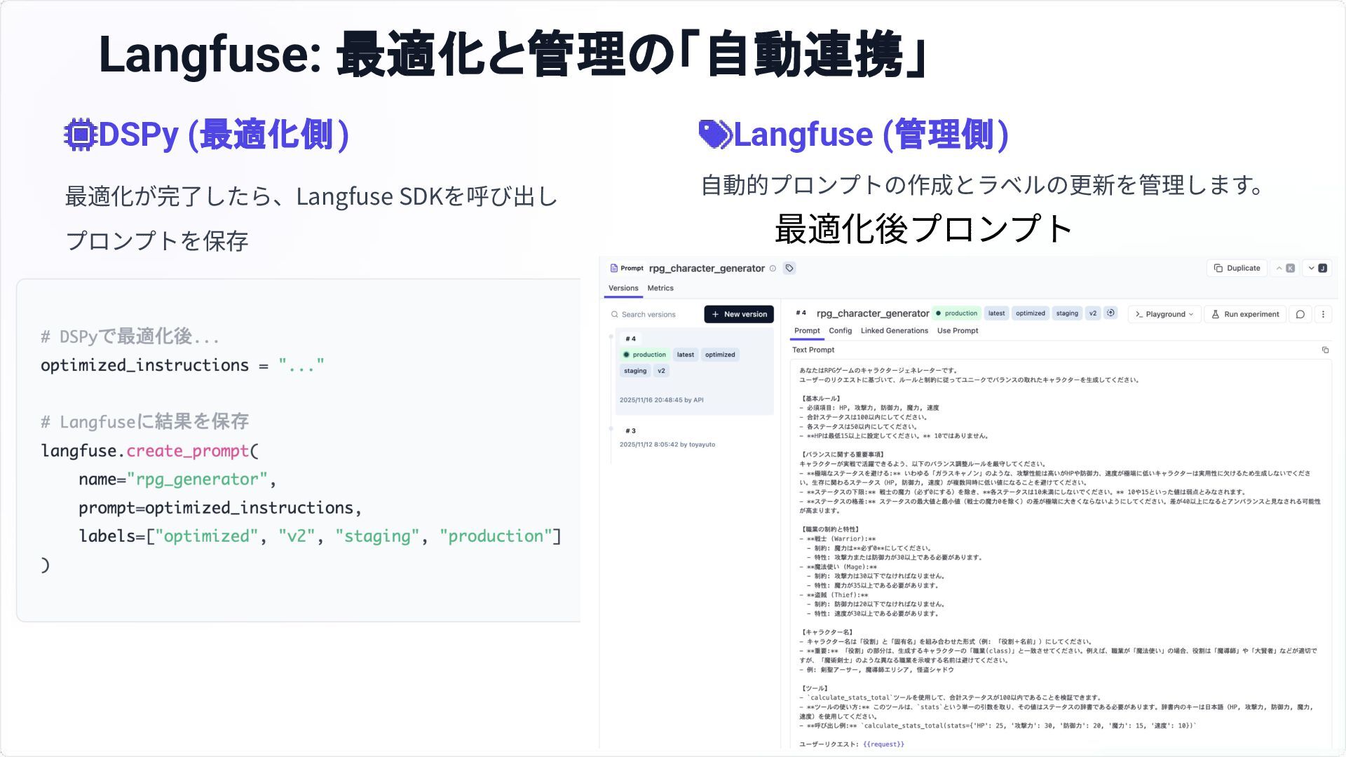 DSPy (最適化側) 最適化が完了したら、Langfuse SDKを呼び出し プロンプトを保存 Langfuse (管理側) ⾃動的プロンプトの作成とラベルの更新を管理します。 Langfuse: 最適化と管理の「自動連携」