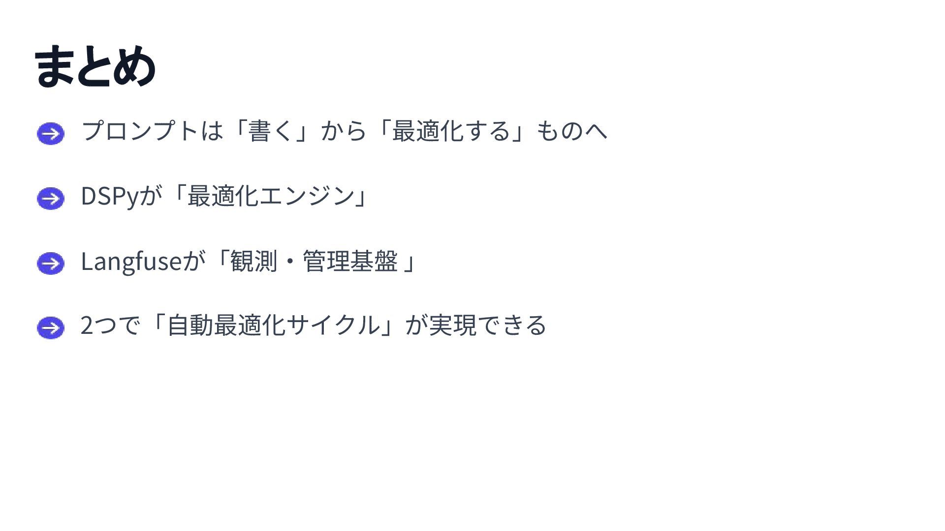 まとめ プロンプトは「書く」から「最適化する」ものへ DSPyが「最適化エンジン」 Langfuseが「観測‧管理基盤 」 2つで「⾃動最適化サイクル」が実現できる