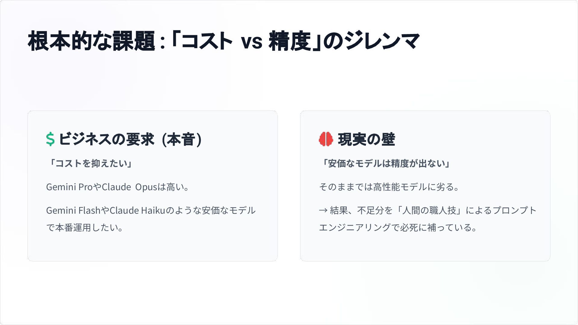 現実の壁 「安価なモデルは精度が出ない」 そのままでは⾼性能モデルに劣る。 → 結果、不⾜分を「⼈間の職⼈技」によるプロンプト エンジニアリングで必死に補っている。 根本的な課題 : 「コスト vs 精度」のジレンマ