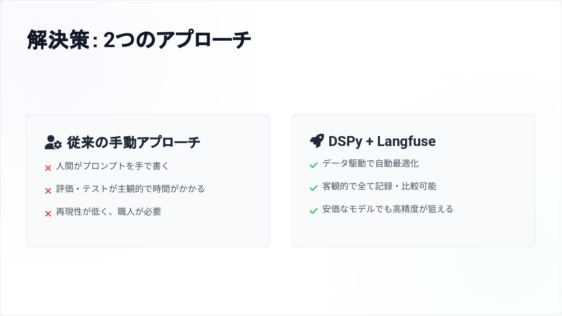 従来の手動アプローチ ⼈間がプロンプトを⼿で書く 評価‧テストが主観的で時間がかかる 再現性が低く、職⼈が必要 DSPy + Langfuse データ駆動で⾃動最適化 客観的で全て記録‧⽐較可能 安価なモデルでも⾼精度が狙える