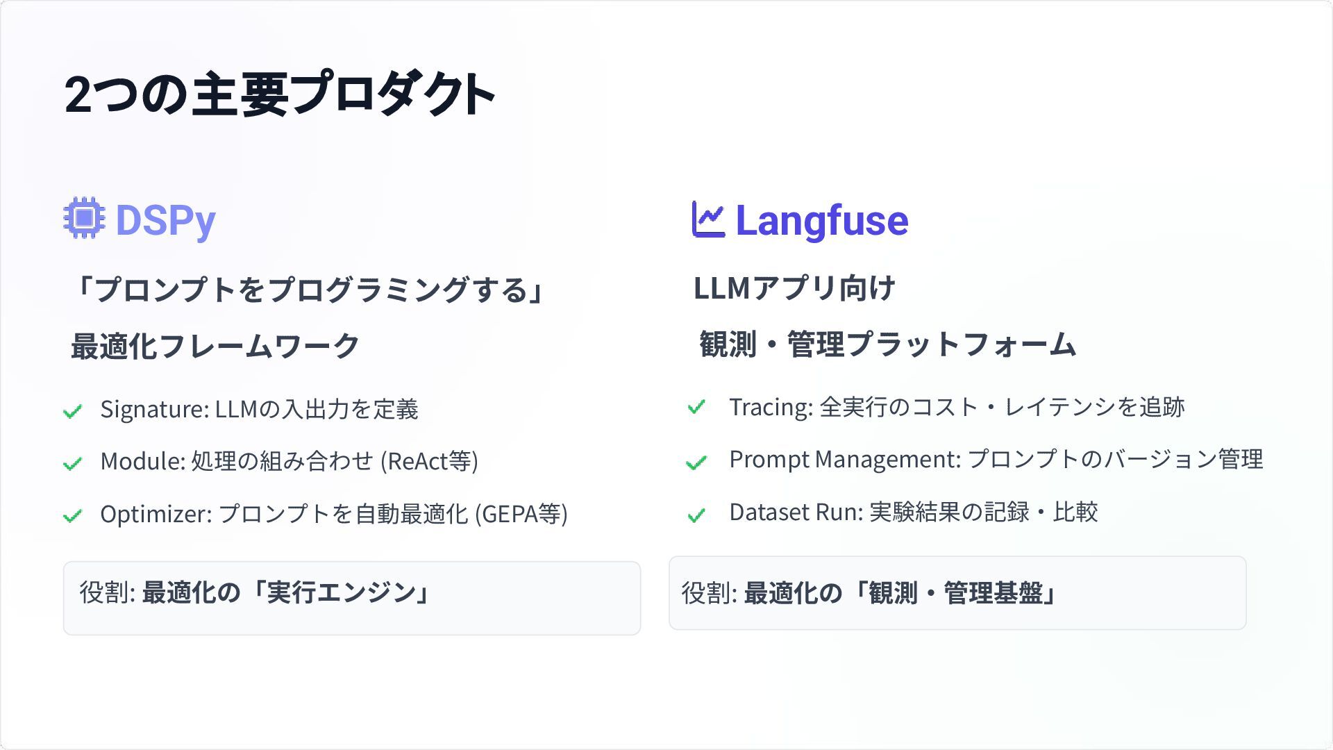 Optimizer: プロンプトを⾃動最適化 (GEPA等) 2つの主要プロダクト Langfuse LLMアプリ向け 観測‧管理プラットフォーム Tracing: 全実⾏のコスト‧レイテンシを追跡 Prompt Management: プロンプトのバージョン管理 Dataset Run: 実験結果の記録‧⽐較 役割: 最適化の「観測‧管理基盤」