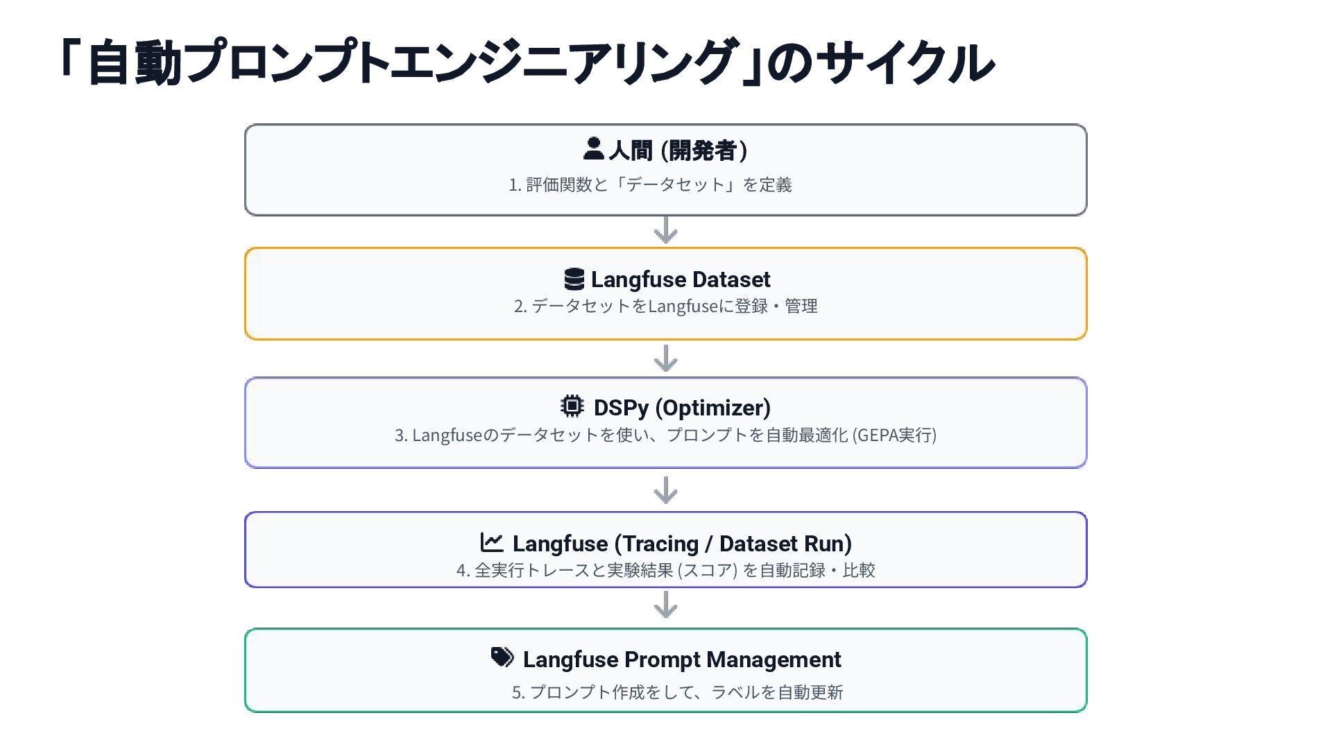 3. Langfuseのデータセットを使い、プロンプトを⾃動最適化 (GEPA実⾏) Langfuse (Tracing / Dataset Run) 4. 全実⾏トレースと実験結果 (スコア) を⾃動記録‧⽐較 Langfuse Prompt Management 「自動プロンプトエンジニアリング」のサイクル 5. プロンプト作成をして、ラベルを⾃動更新