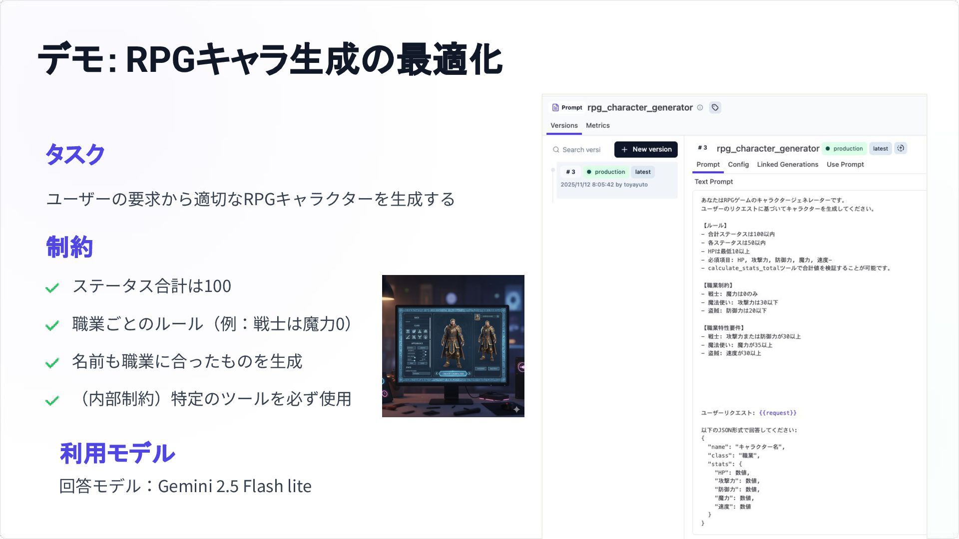 タスク ユーザーの要求から適切なRPGキャラクターを⽣成する 制約 ステータス合計は100 職業ごとのルール(例:戦⼠は魔⼒0) 名前も職業に合ったものを⽣成 (内部制約)特定のツールを必ず使⽤ デモ:RPGキャラ生成の最適化 利用モデル 回答モデル:Gemini