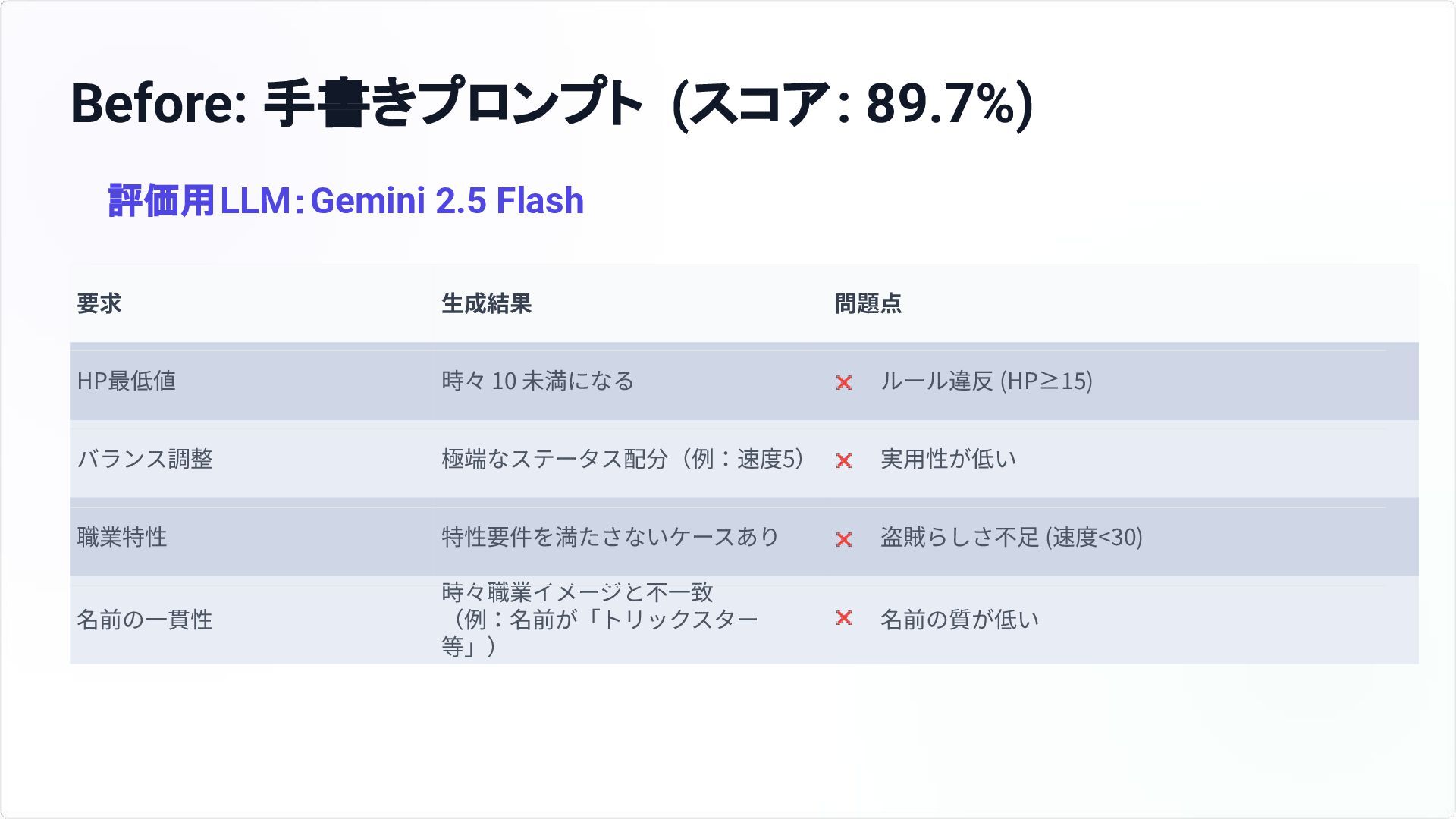 極端なステータス配分(例:速度5) 実⽤性が低い 職業特性 特性要件を満たさないケースあり 盗賊らしさ不⾜ (速度<30) 名前の⼀貫性 時々職業イメージと不⼀致 (例:名前が「トリックスター 等」) 名前の質が低い Before: 手書きプロンプト (スコア: 89.7%) 評価用LLM:Gemini 2.5 Flash
