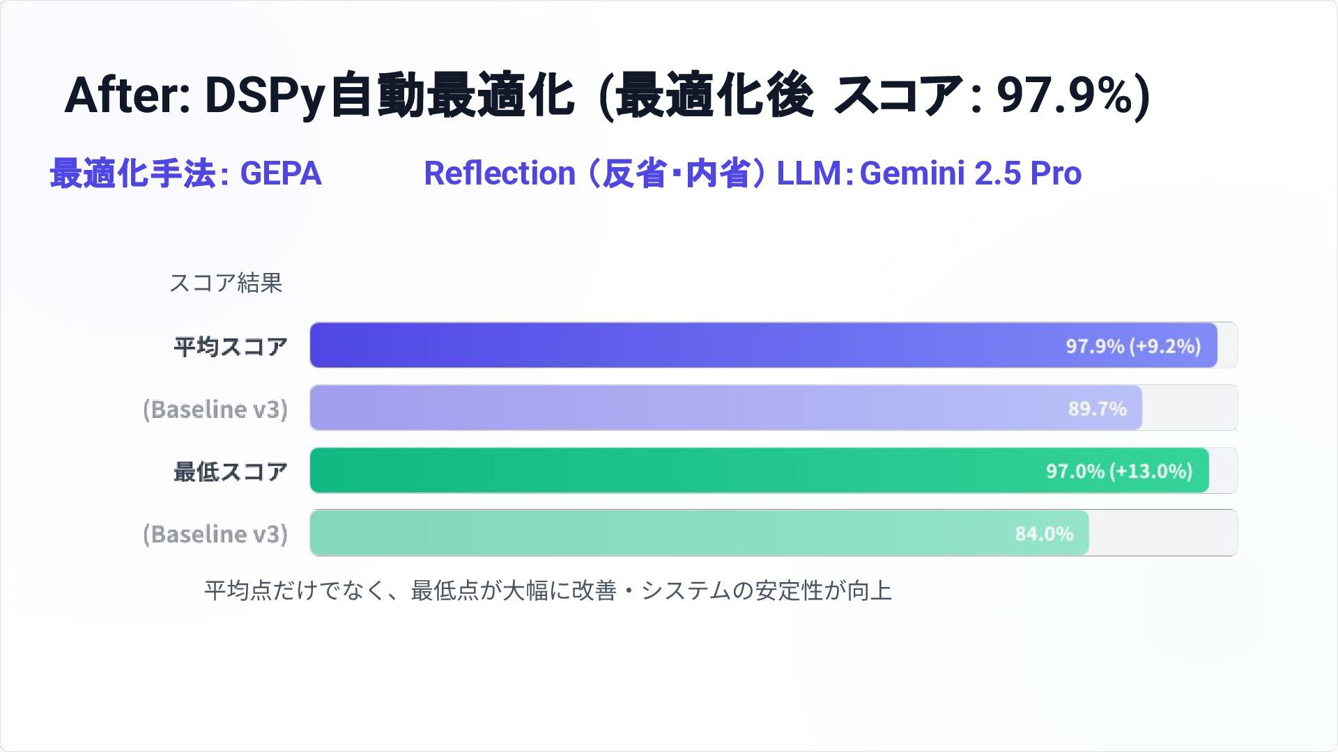 平均点だけでなく、最低点が⼤幅に改善‧システムの安定性が向上 After: DSPy自動最適化 (最適化後 スコア: 97.9%) 最適化手法: GEPA Reflection (反省・内省)