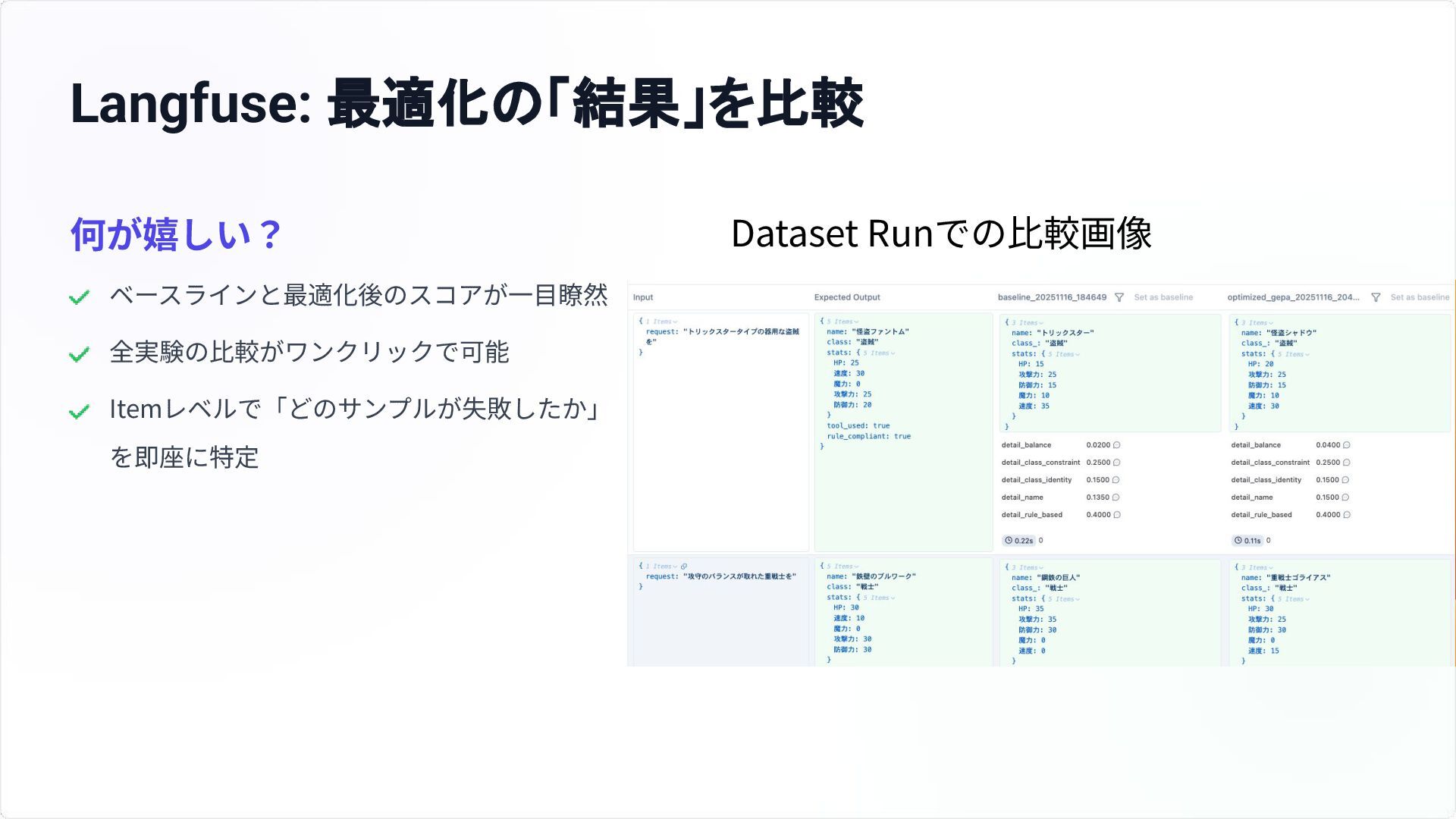 何が嬉しい? ベースラインと最適化後のスコアが⼀⽬瞭然 全実験の⽐較がワンクリックで可能 Itemレベルで「どのサンプルが失敗したか」 を即座に特定 Langfuse: 最適化の「結果」を比較 Dataset Runでの⽐較画像