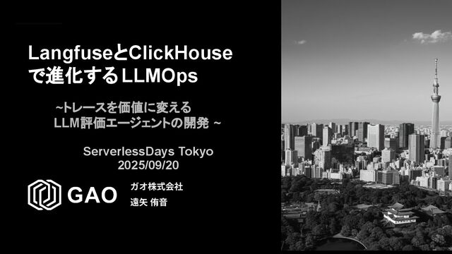 ガオ株式会社 遠⽮ 侑⾳ ~トレースを価値に変える LLM評価エージェントの開発 ~ ServerlessDays Tokyo 2025/09/20 LangfuseとClickHouse