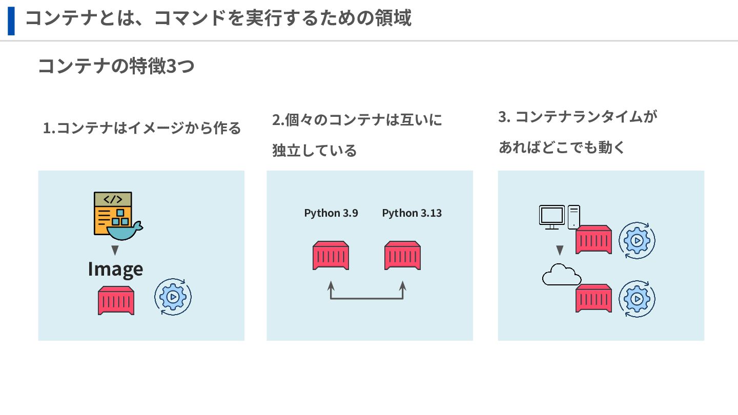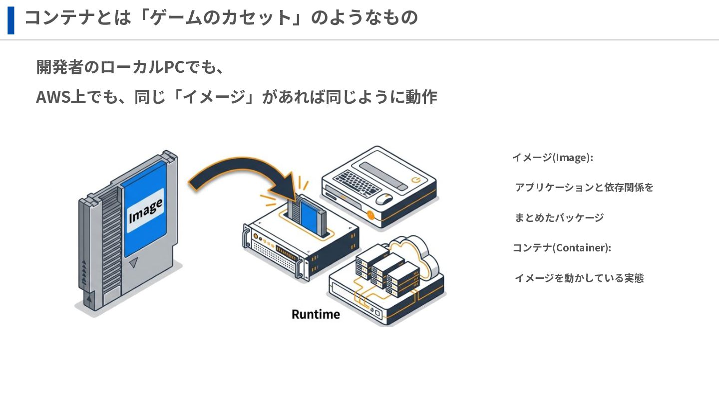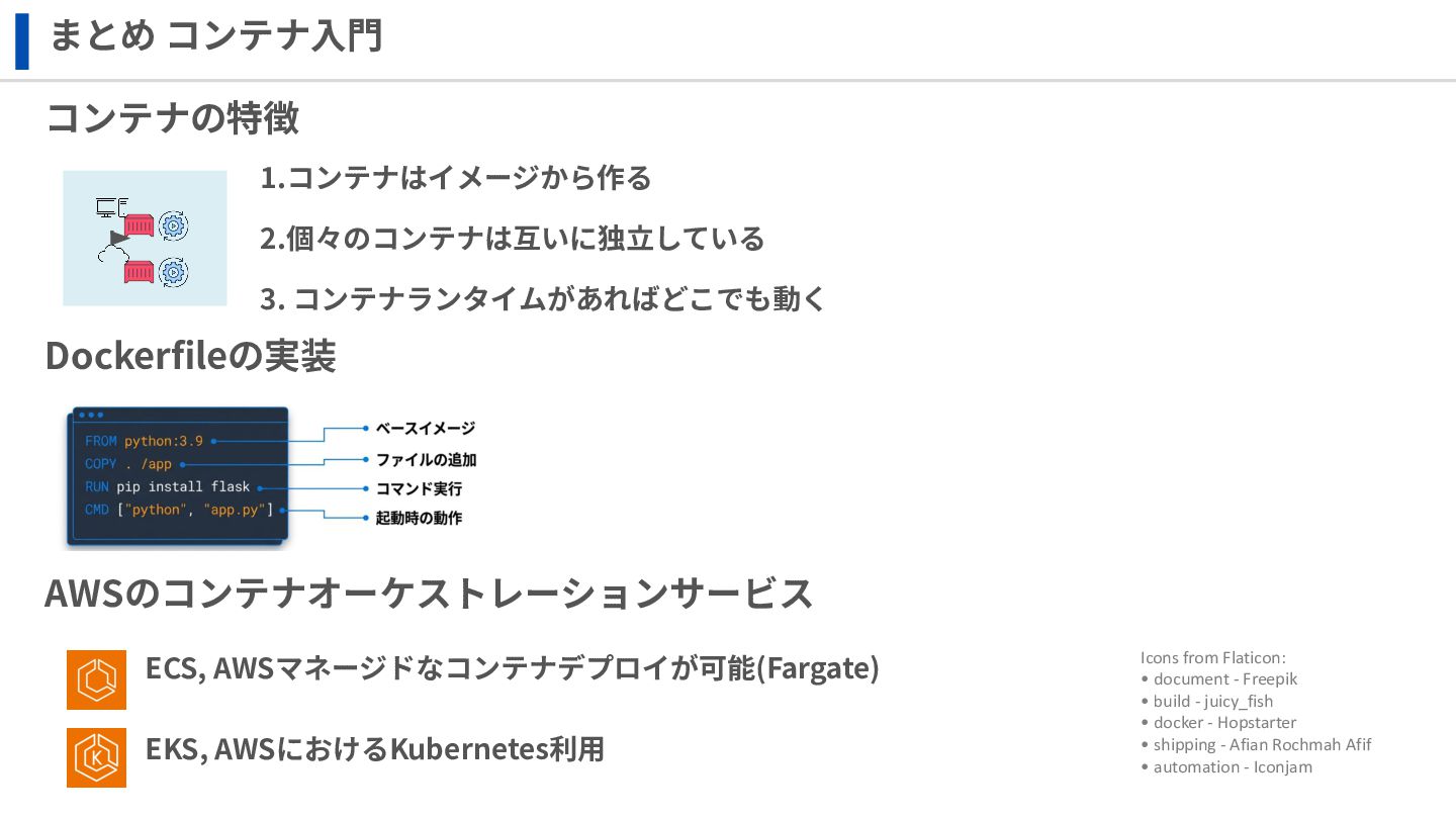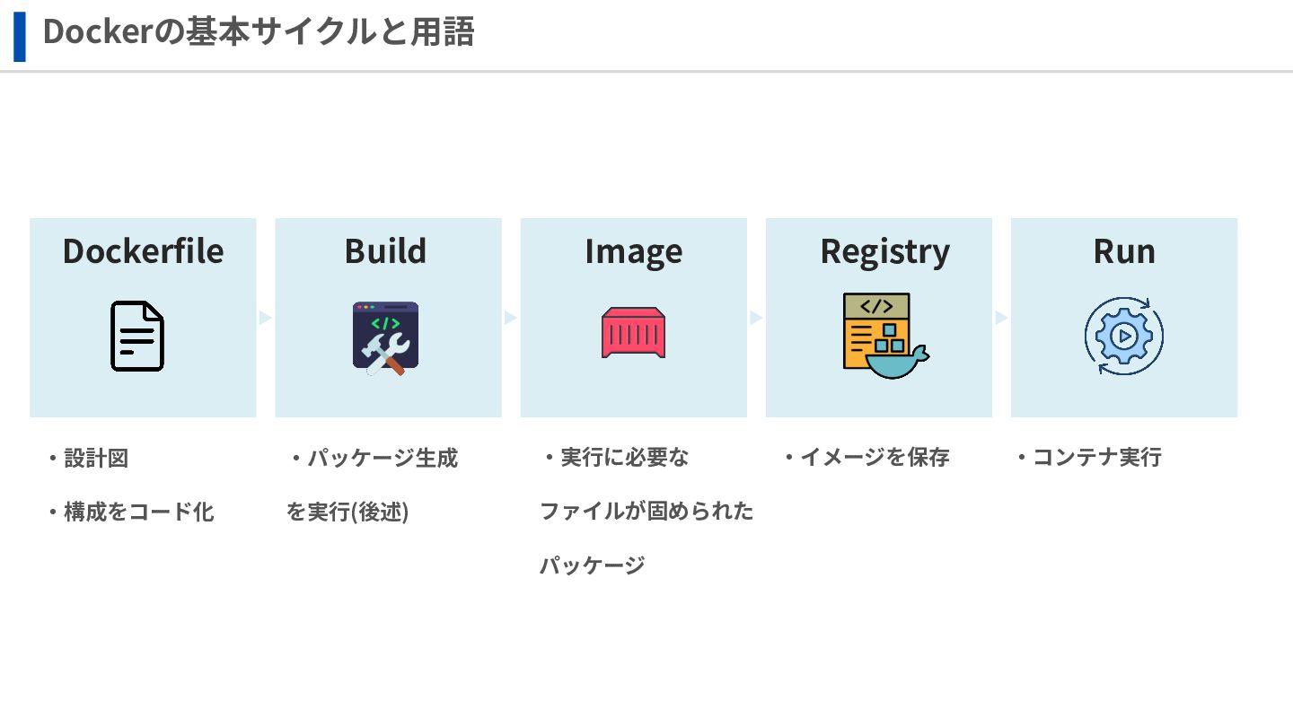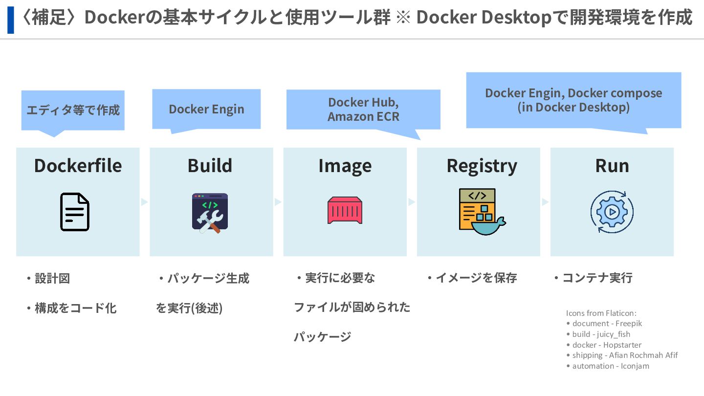 ‧構成をコード化 ‧実⾏に必要な ファイルが固められた パッケージ ‧イメージを保存 ‧コンテナ実⾏ ‧パッケージ⽣成 を実⾏(後述) Docker Engin エディタ等で作成 Docker Engin, Docker compose (in Docker Desktop) Docker Hub, Amazon ECR Icons from Flaticon: • document - Freepik • build - juicy_fish • docker - Hopstarter • shipping - Afian Rochmah Afif • automation - Iconjam