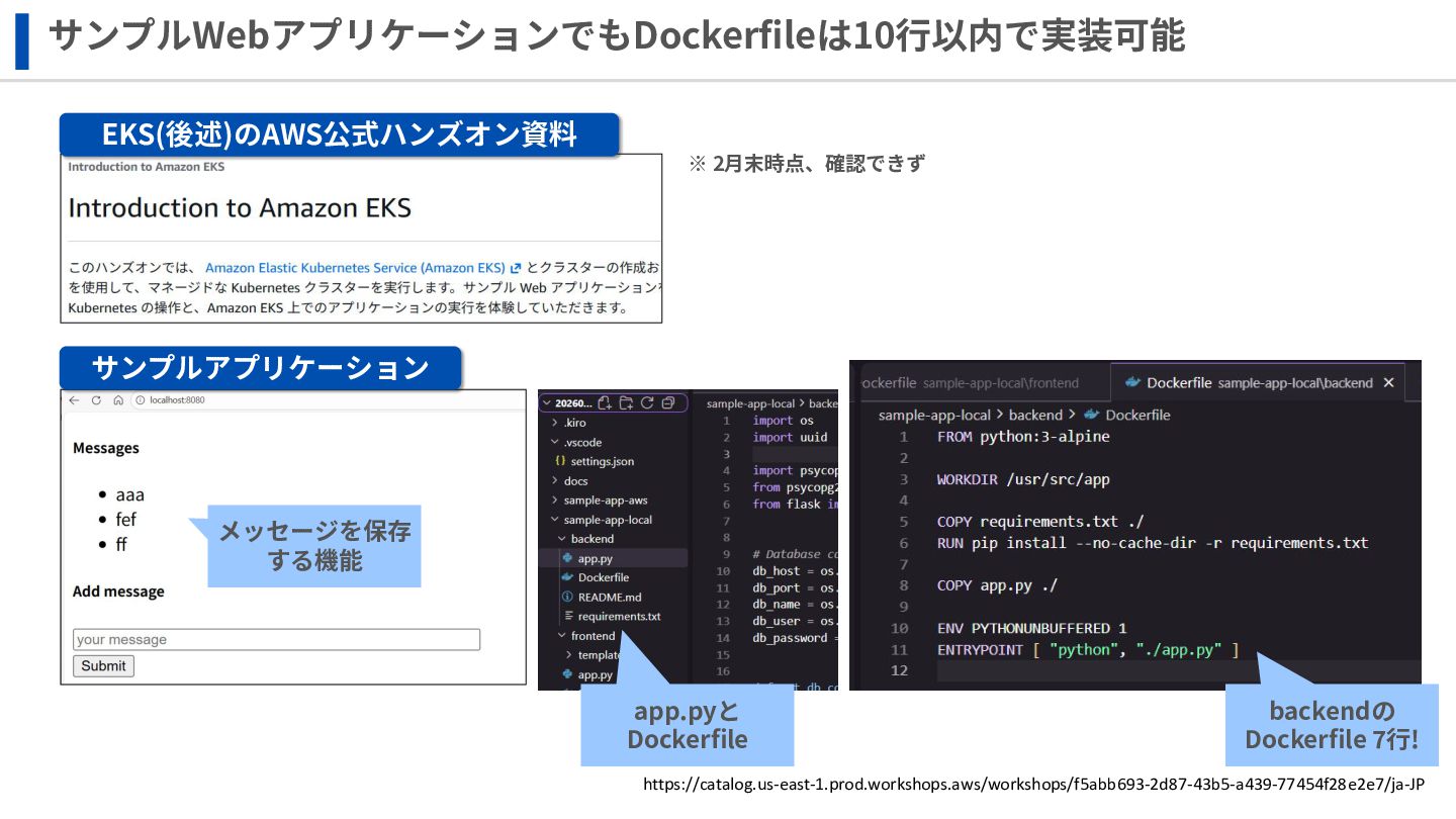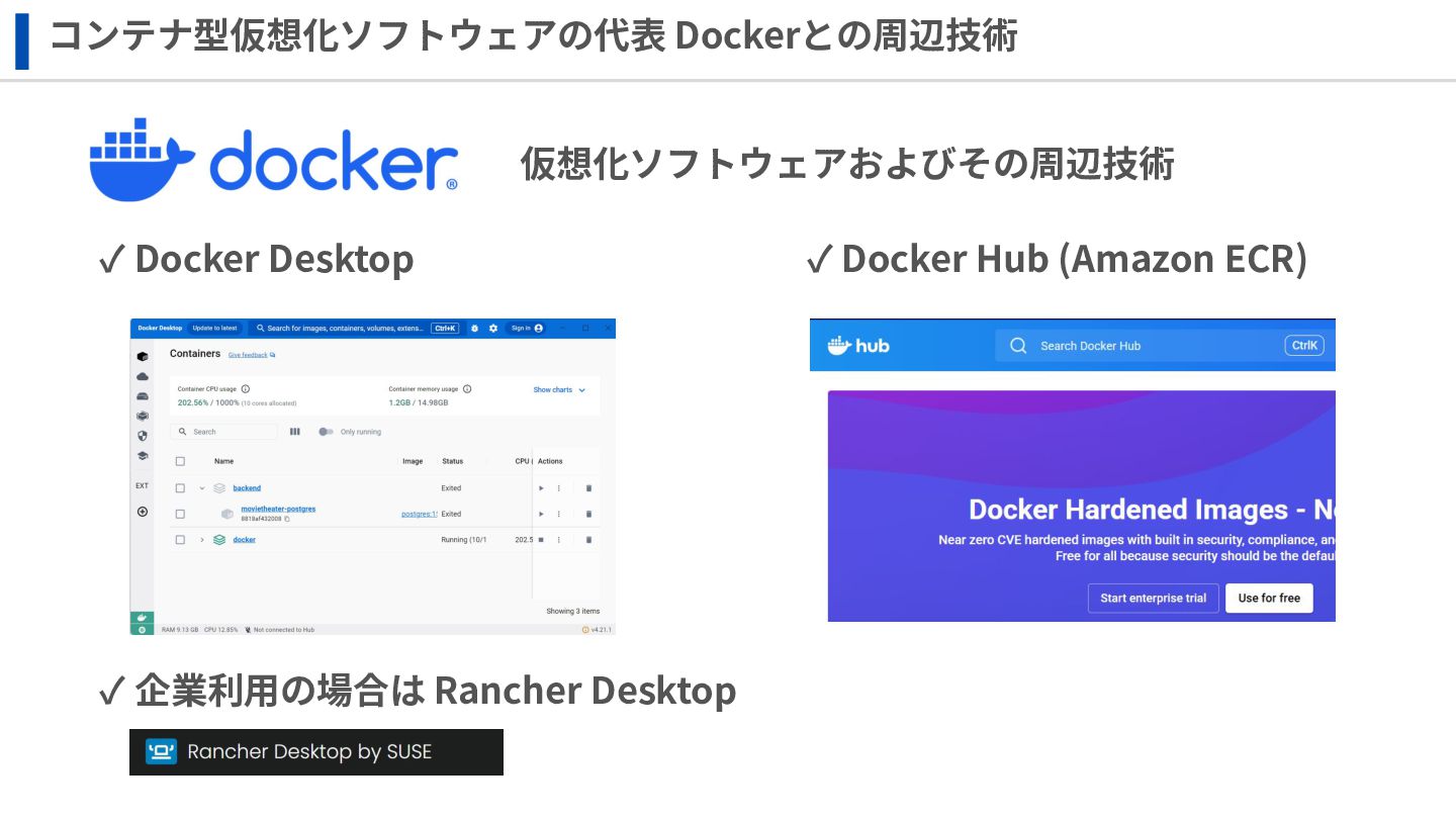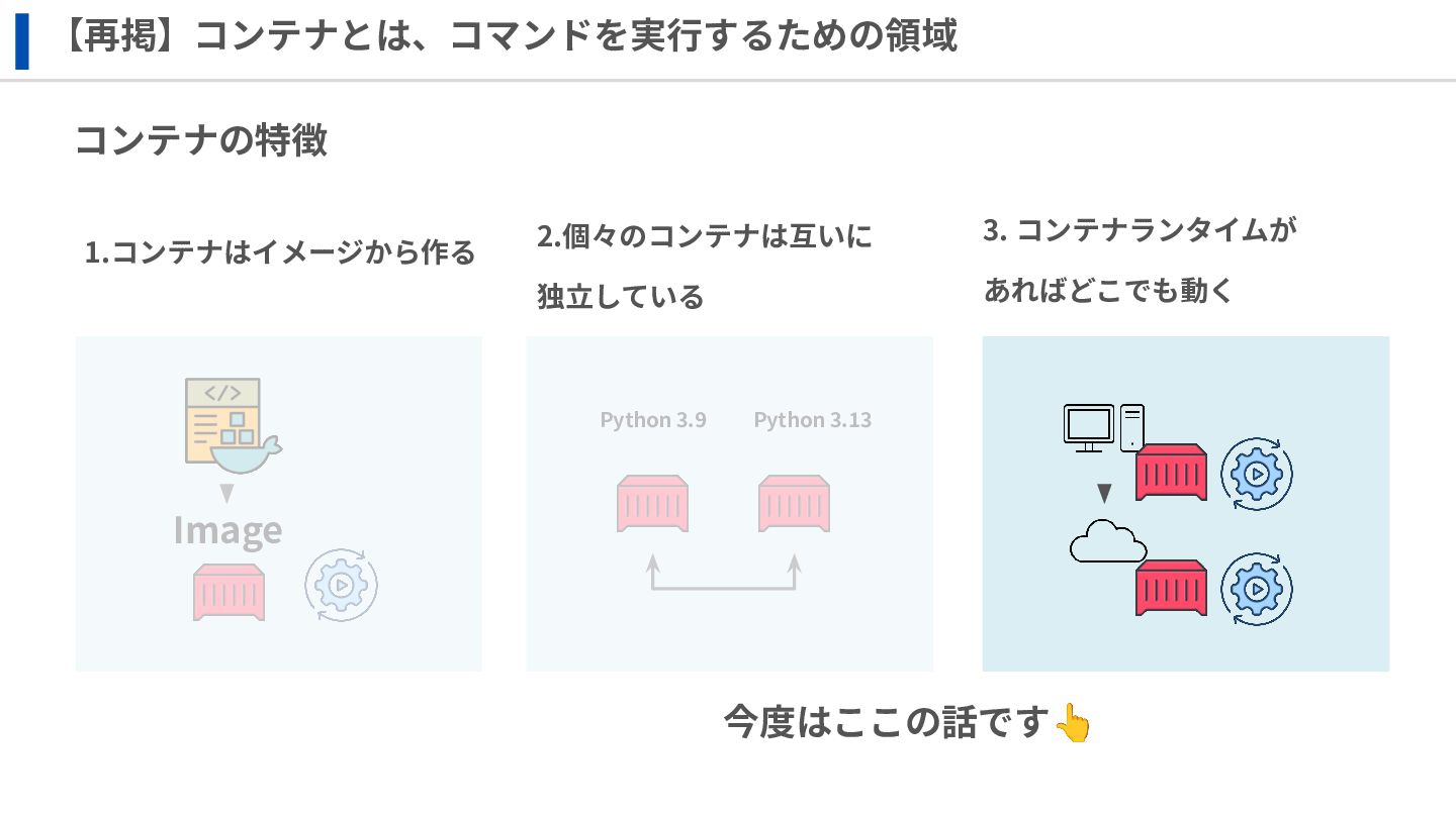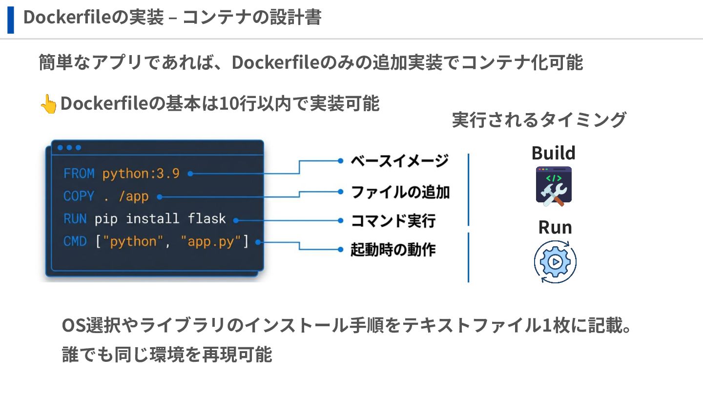 ‧構成をコード化 ‧実⾏に必要な ファイルが固められた パッケージ ‧イメージを保存 ‧コンテナ実⾏ ‧パッケージ⽣成 を実⾏(後述) Docker Engin エディタ等で作成 Docker Engin, Docker compose (in Docker Desktop) Docker Hub, Amazon ECR Icons from Flaticon: • document - Freepik • build - juicy_fish • docker - Hopstarter • shipping - Afian Rochmah Afif • automation - Iconjam