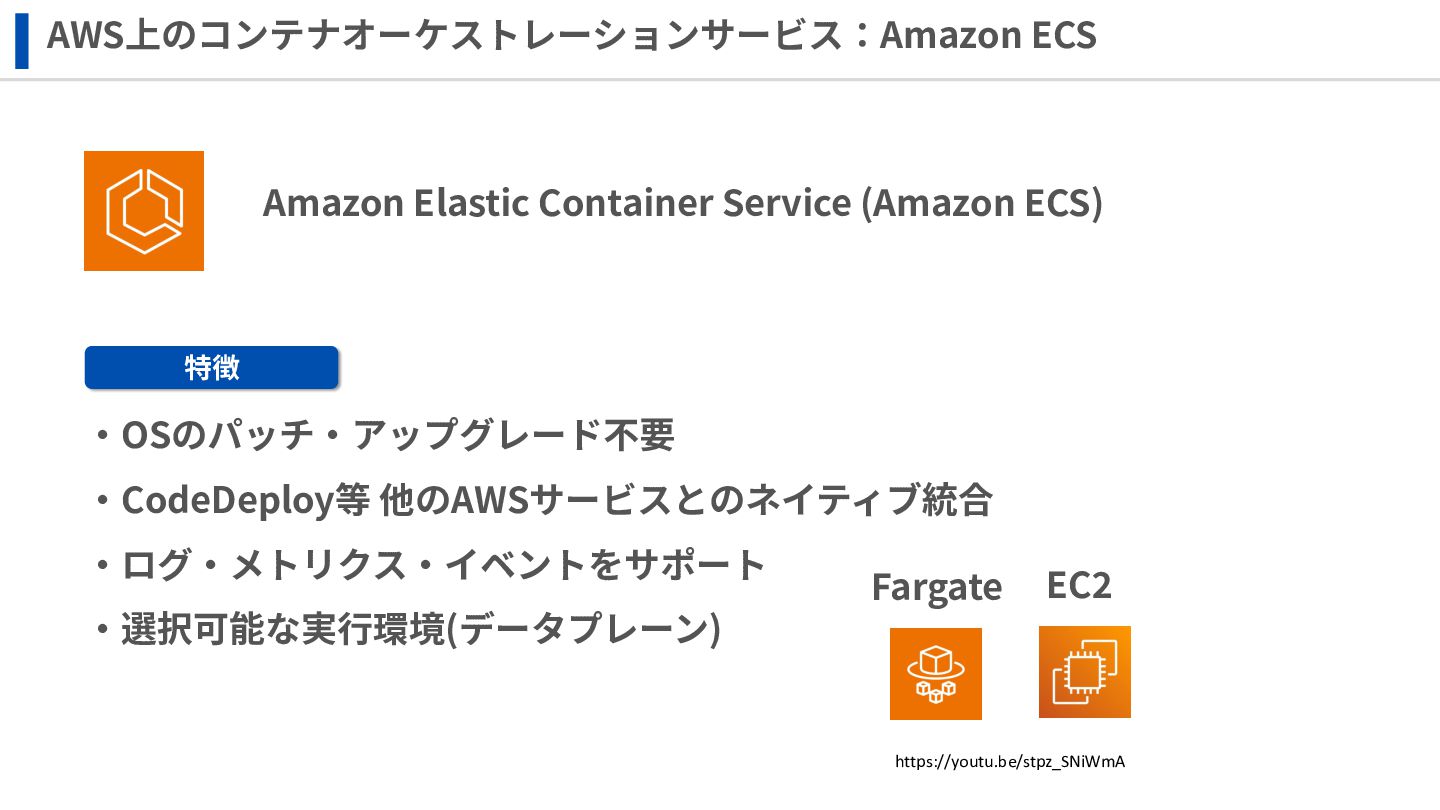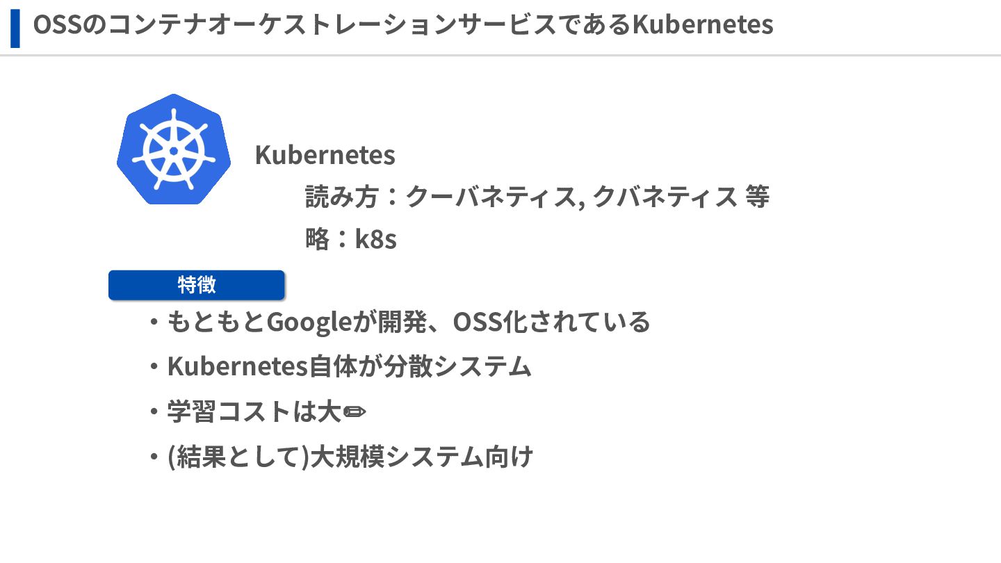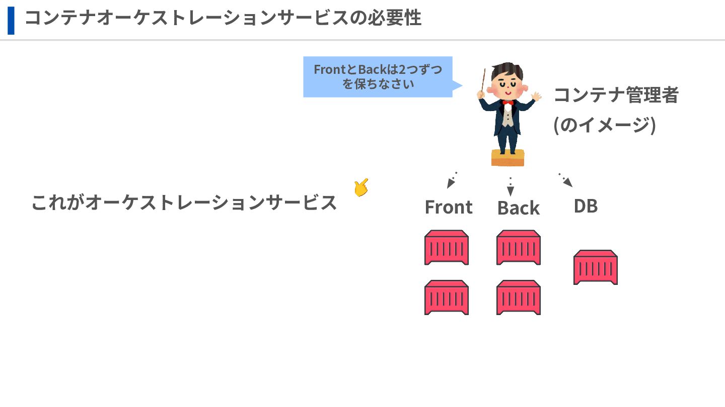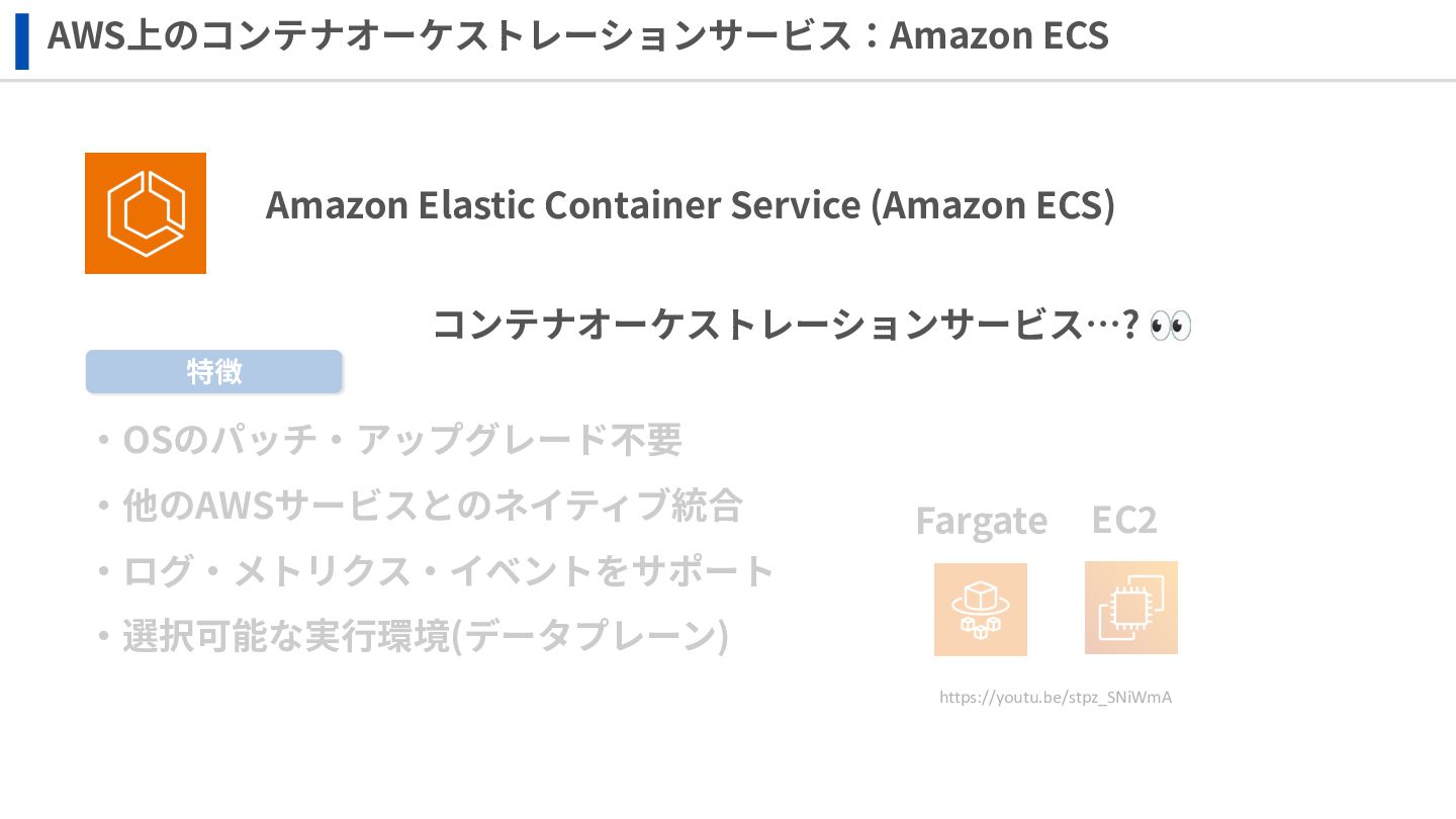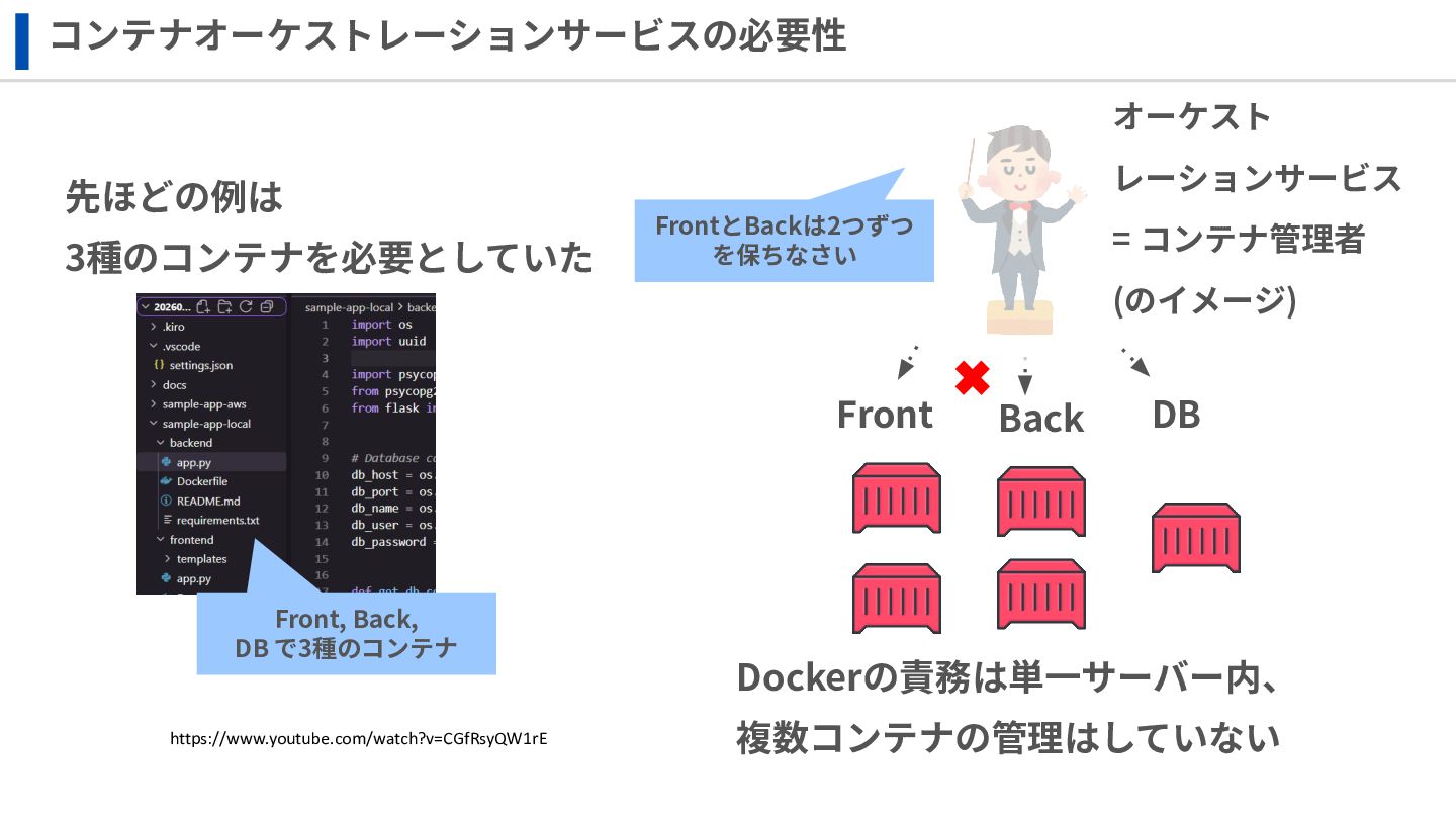 ‧構成をコード化 ‧実⾏に必要な ファイルが固められた パッケージ ‧イメージを保存 ‧コンテナ実⾏ ‧パッケージ⽣成 を実⾏(後述) Docker Engin エディタ等で作成 Docker Engin, Docker compose (in Docker Desktop) Docker Hub, Amazon ECR Icons from Flaticon: • document - Freepik • build - juicy_fish • docker - Hopstarter • shipping - Afian Rochmah Afif • automation - Iconjam