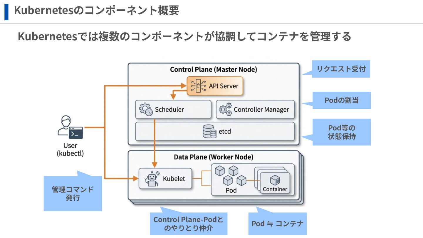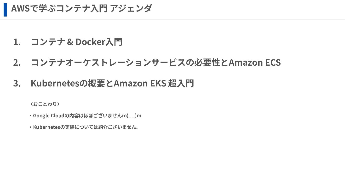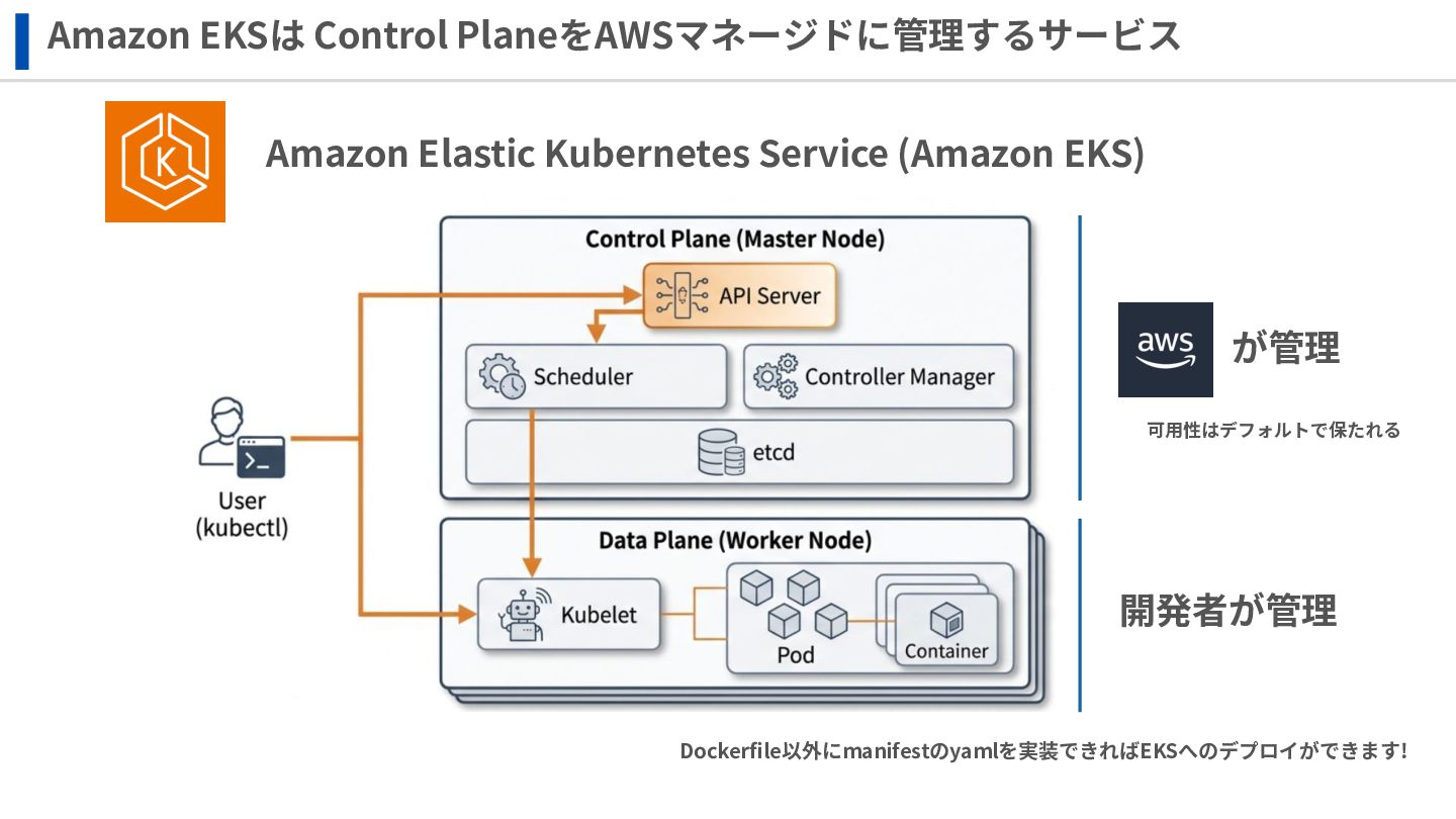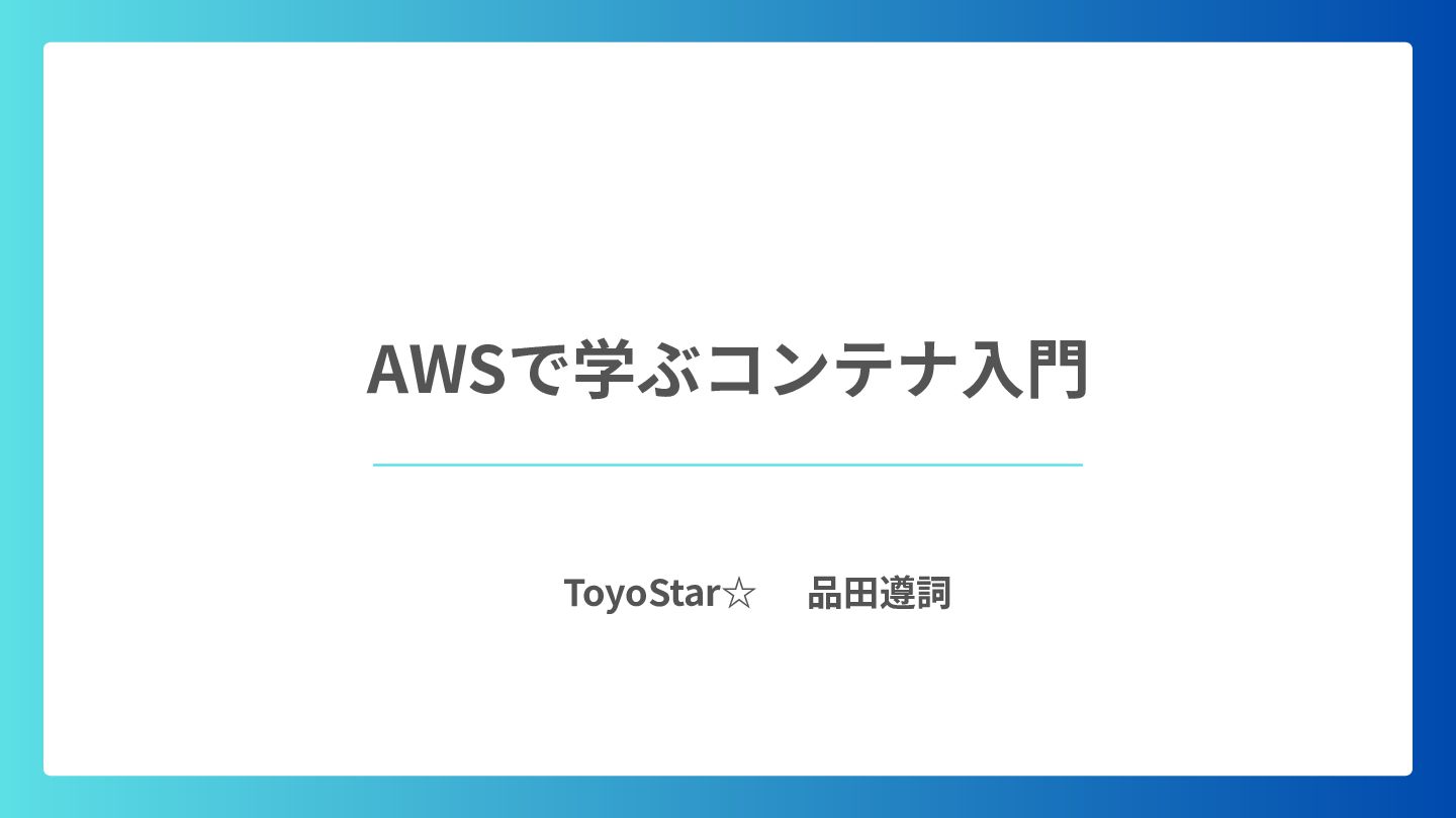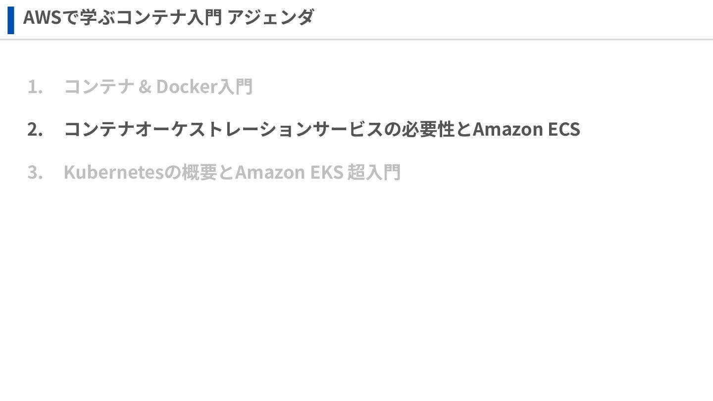 ‧構成をコード化 ‧実⾏に必要な ファイルが固められた パッケージ ‧イメージを保存 ‧コンテナ実⾏ ‧パッケージ⽣成 を実⾏(後述) Docker Engin エディタ等で作成 Docker Engin, Docker compose (in Docker Desktop) Docker Hub, Amazon ECR Icons from Flaticon: • document - Freepik • build - juicy_fish • docker - Hopstarter • shipping - Afian Rochmah Afif • automation - Iconjam