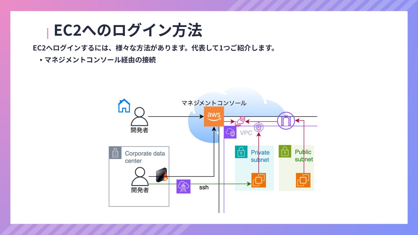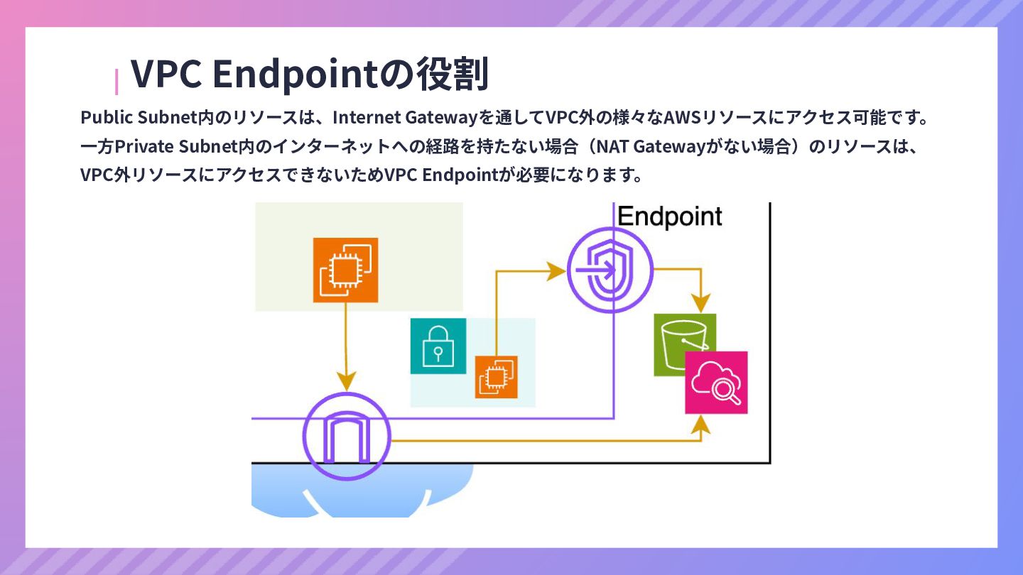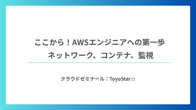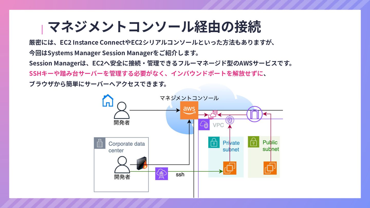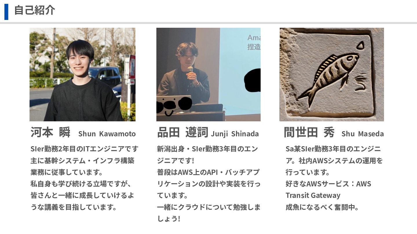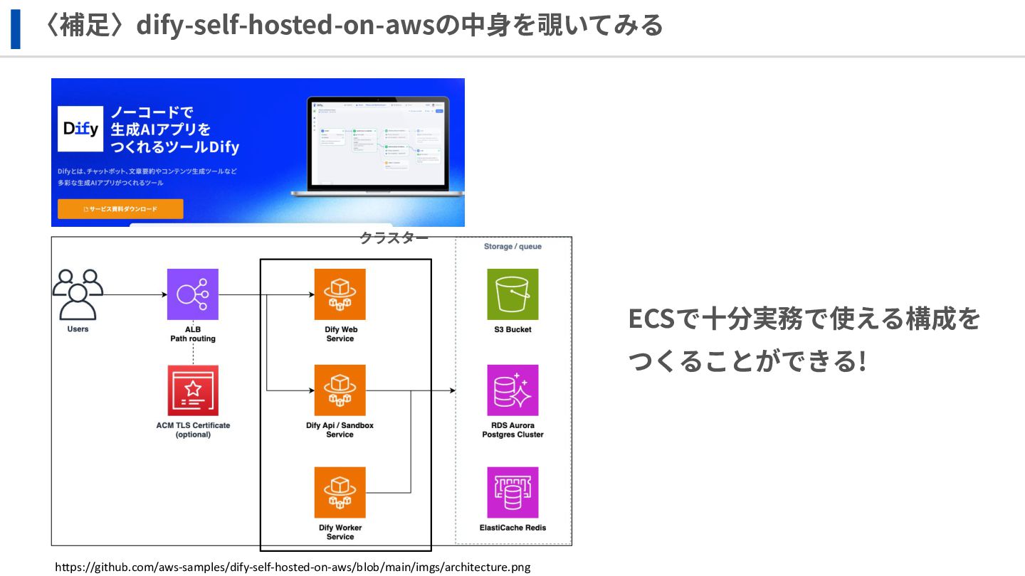 ‧構成をコード化 ‧実⾏に必要な ファイルが固められた パッケージ ‧イメージを保存 ‧コンテナ実⾏ ‧パッケージ⽣成 を実⾏(後述) Docker Engin エディタ等で作成 Docker Engin, Docker compose (in Docker Desktop) Docker Hub, Amazon ECR Icons from Flaticon: • document - Freepik • build - juicy_fish • docker - Hopstarter • shipping - Afian Rochmah Afif • automation - Iconjam