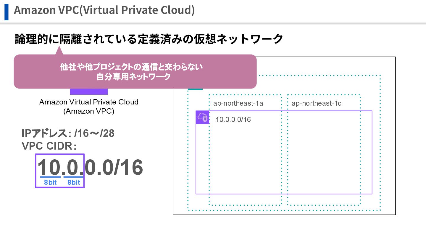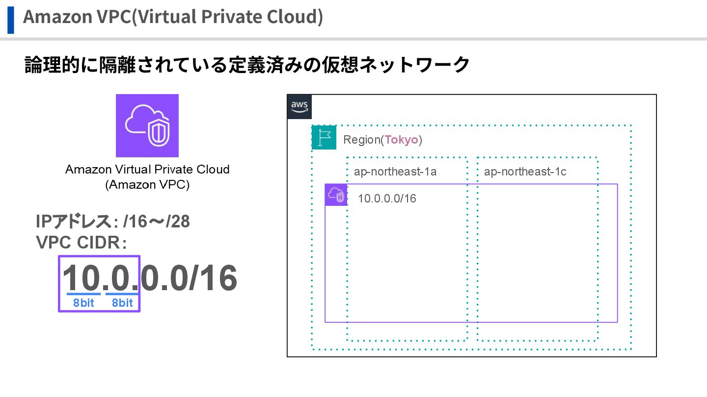 Amazon VPC(Virtual Private Cloud) 論理的に隔離されている定義済みの仮想ネットワーク Region(Tokyo) ap-northeast-1a ap-northeast-1c IPアドレス: /16〜/28