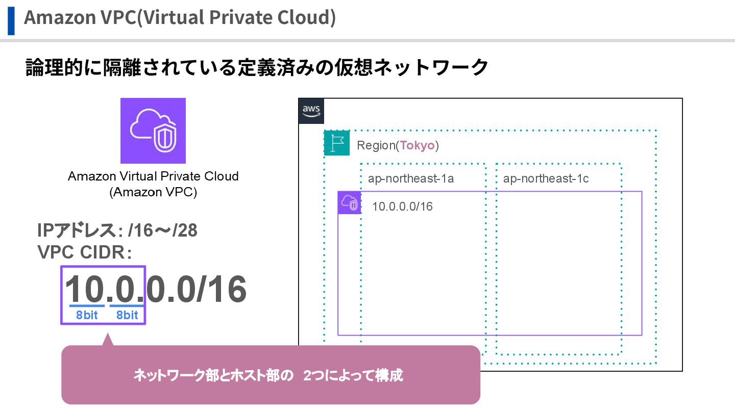 VPC CIDR: 10.0.0.0/16 10.0.0.0/16 8bit 8bit ネットワーク部とホスト部の 2つによって構成