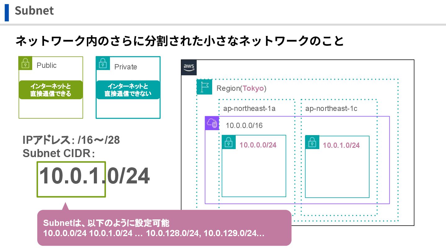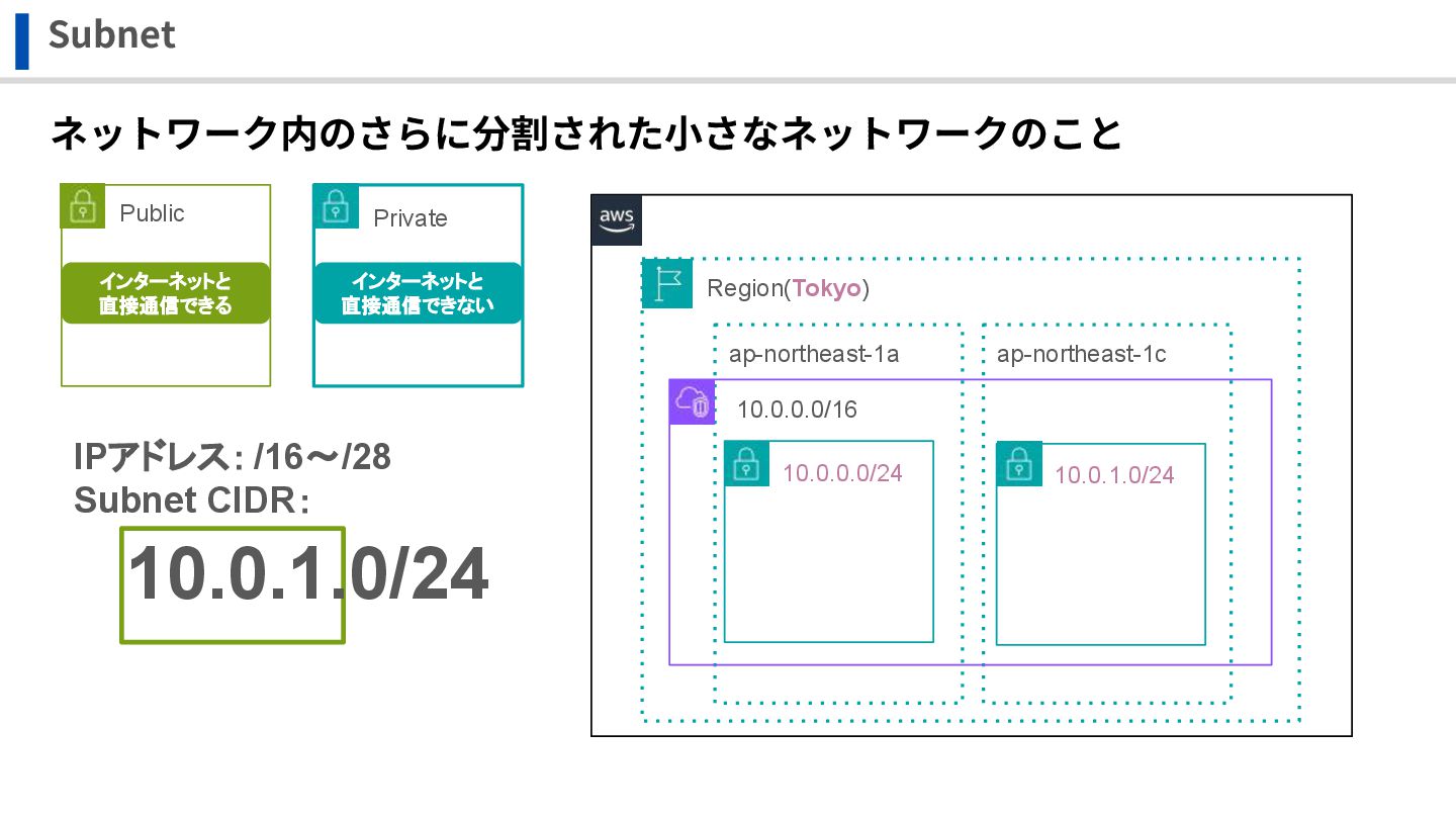 Subnet ネットワーク内のさらに分割された⼩さなネットワークのこと Region(Tokyo) ap-northeast-1a ap-northeast-1c IPアドレス: /16〜/28 Subnet CIDR: 10.0.0.0/16