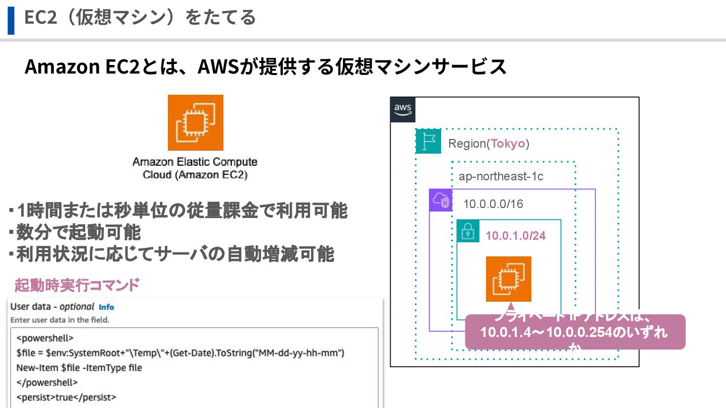 か ・1時間または秒単位の従量課金で利用可能 ・数分で起動可能 ・利用状況に応じてサーバの自動増減可能 起動時実行コマンド