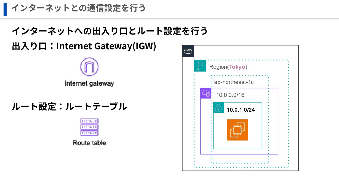 インターネットとの通信設定を⾏う インターネットへの出⼊り⼝とルート設定を⾏う 出⼊り⼝:Internet Gateway(IGW) ルート設定:ルートテーブル Region(Tokyo) ap-northeast-1c 10.0.0.0/16 10.0.1.0/24