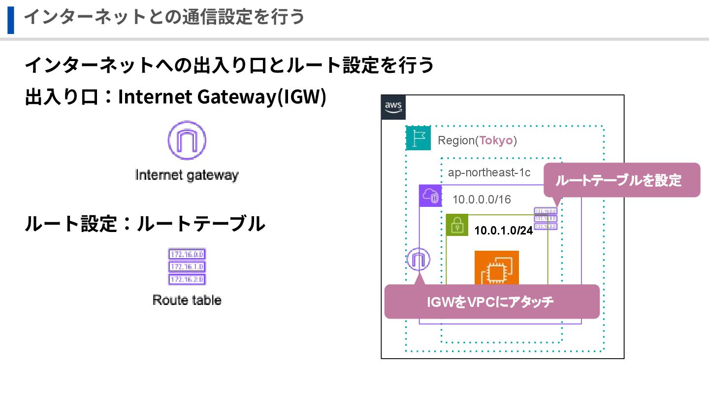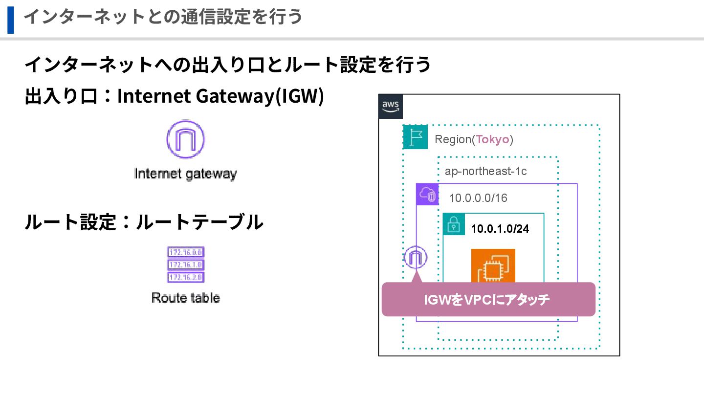 インターネットとの通信設定を⾏う インターネットへの出⼊り⼝とルート設定を⾏う 出⼊り⼝:Internet Gateway(IGW) ルート設定:ルートテーブル Region(Tokyo) ap-northeast-1c 10.0.0.0/16 10.0.1.0/24 IGWをVPCにアタッチ