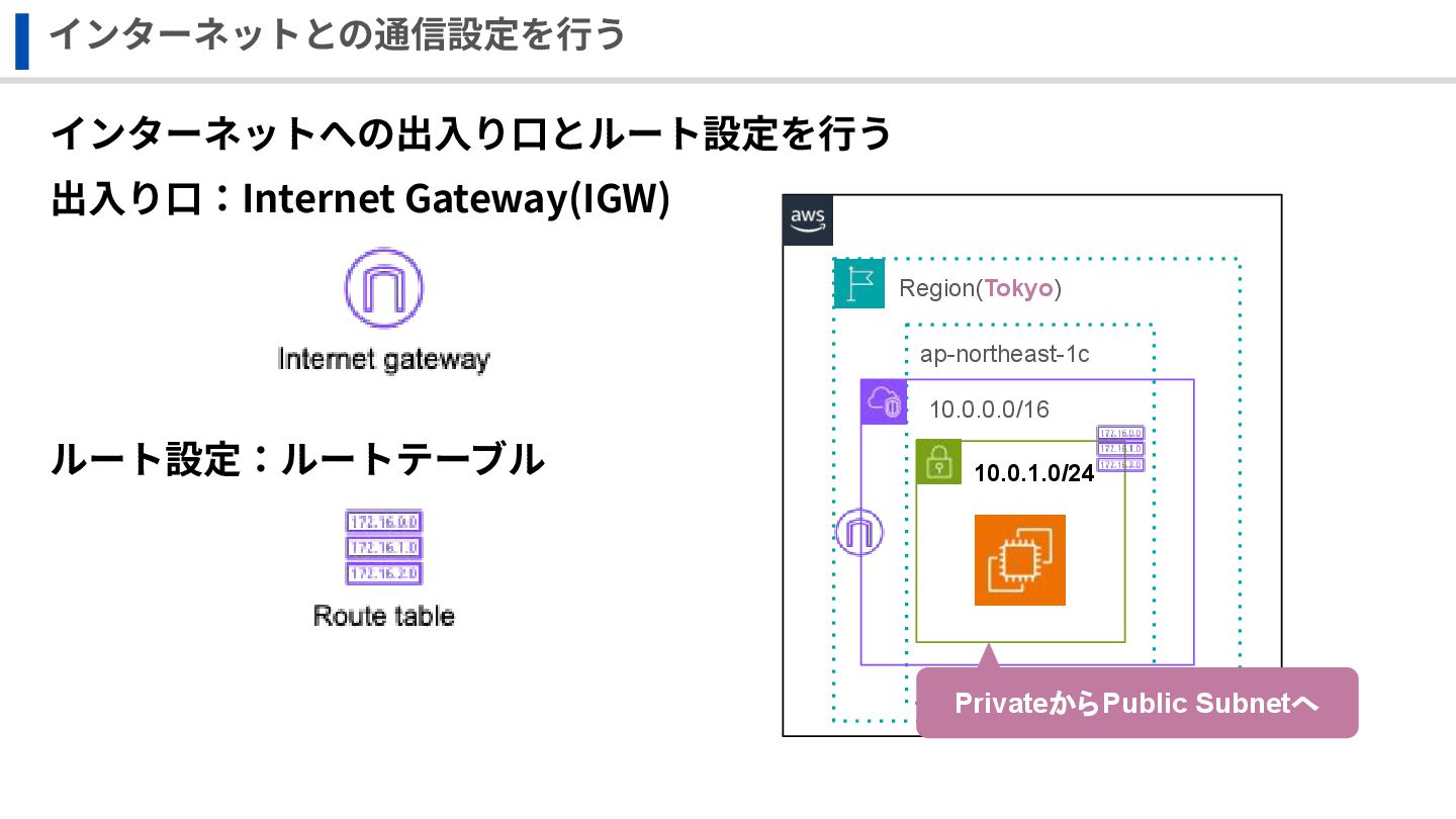 インターネットとの通信設定を⾏う インターネットへの出⼊り⼝とルート設定を⾏う 出⼊り⼝:Internet Gateway(IGW) ルート設定:ルートテーブル Region(Tokyo) ap-northeast-1c 10.0.0.0/16 10.0.1.0/24 PrivateからPublic