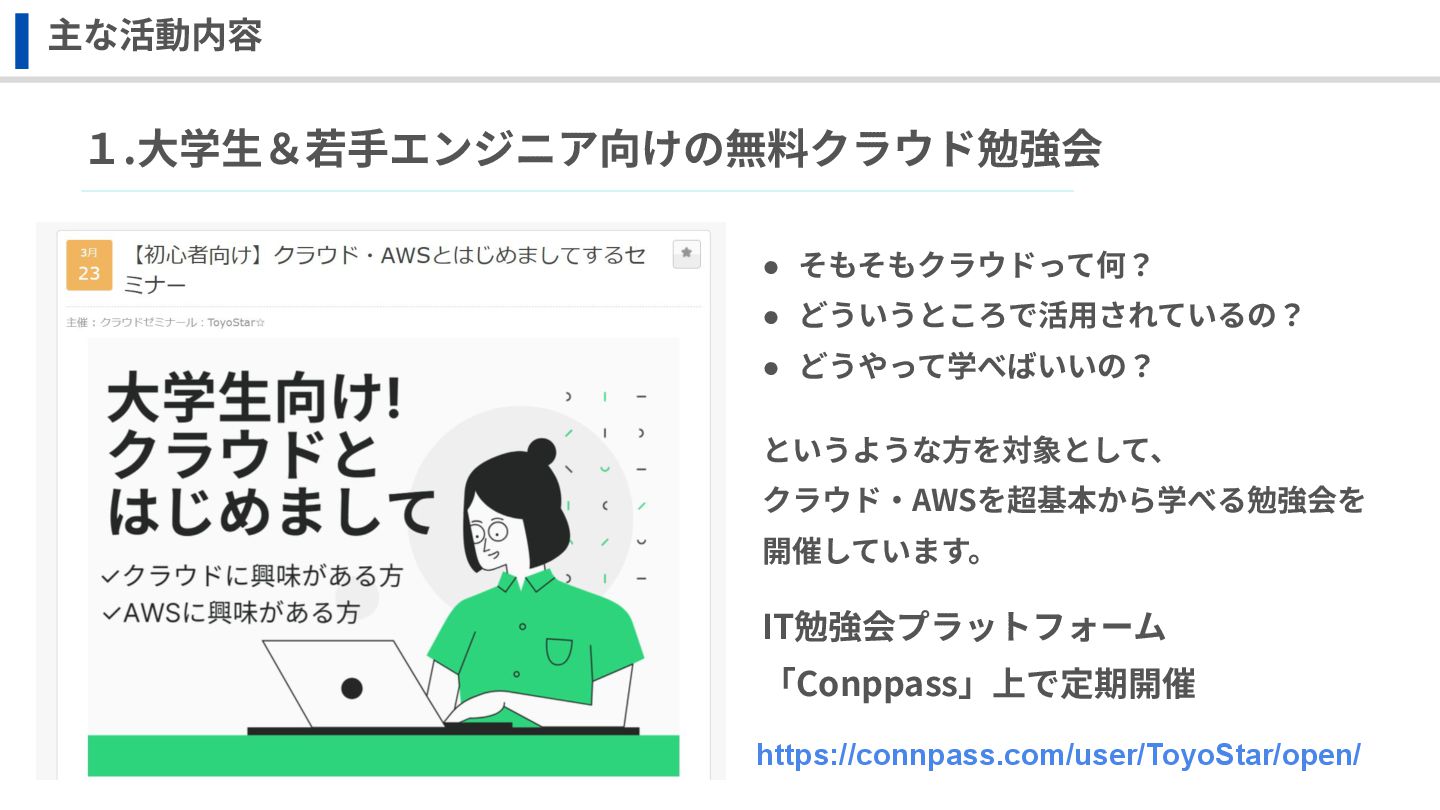 1.⼤学⽣&若⼿エンジニア向けの無料クラウド勉強会 主な活動内容 • そもそもクラウドって何? • どういうところで活⽤されているの? • どうやって学べばいいの? IT勉強会プラットフォーム 「Conppass」上で定期開催