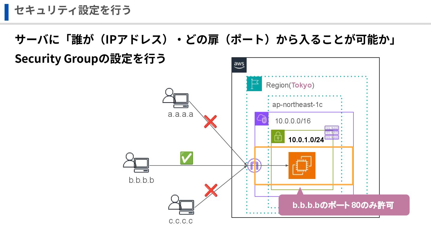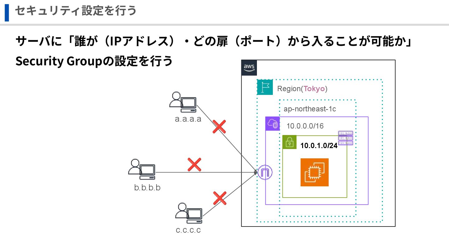 セキュリティ設定を⾏う サーバに「誰が(IPアドレス)‧どの扉(ポート)から⼊ることが可能か」 Security Groupの設定を⾏う Region(Tokyo) ap-northeast-1c 10.0.0.0/16 10.0.1.0/24 a.a.a.a b.b.b.b