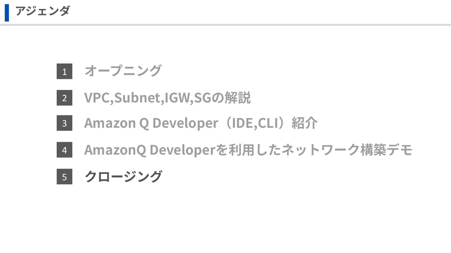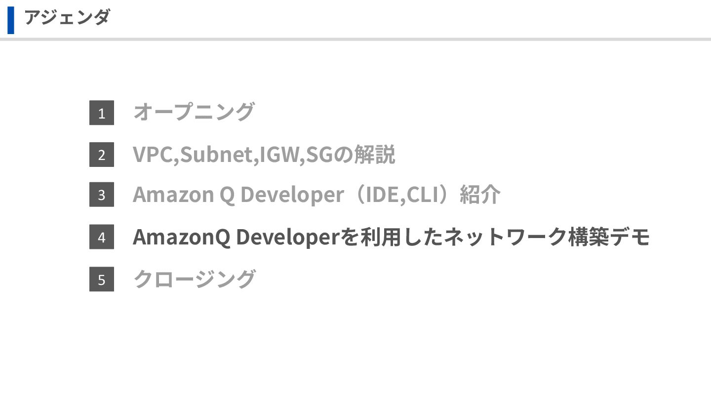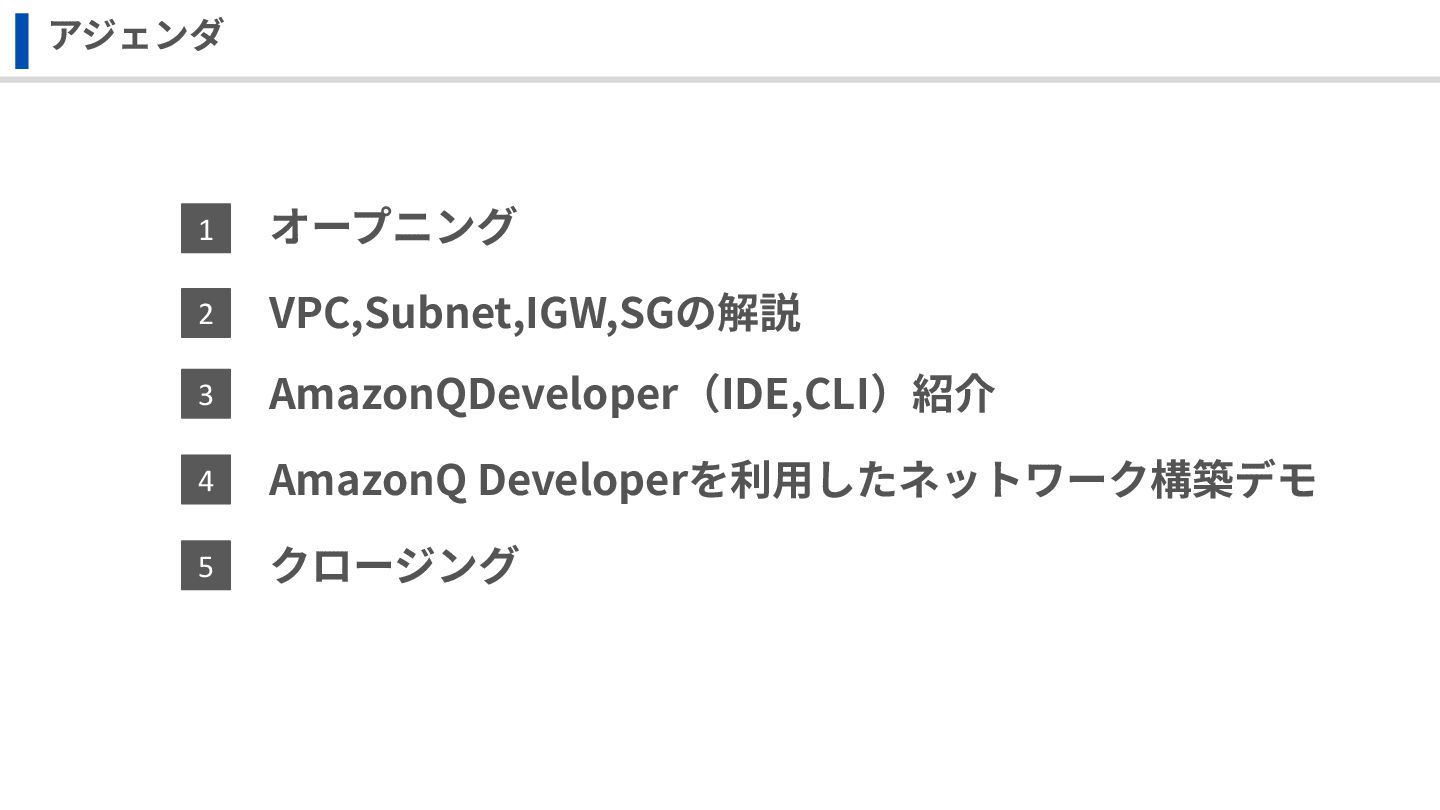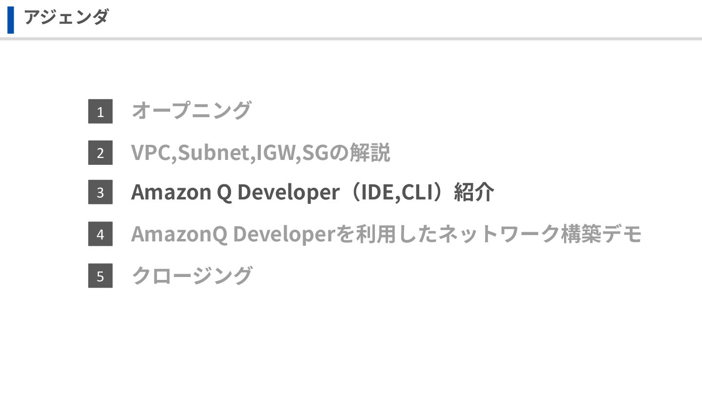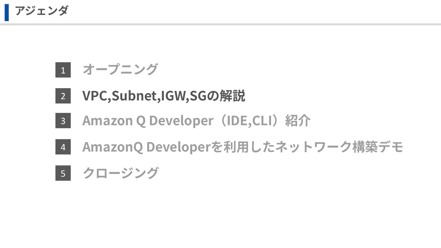 アジェンダ 1 VPC,Subnet,IGW,SGの解説 2 オープニング Amazon Q Developer(IDE,CLI)紹介 3 AmazonQ