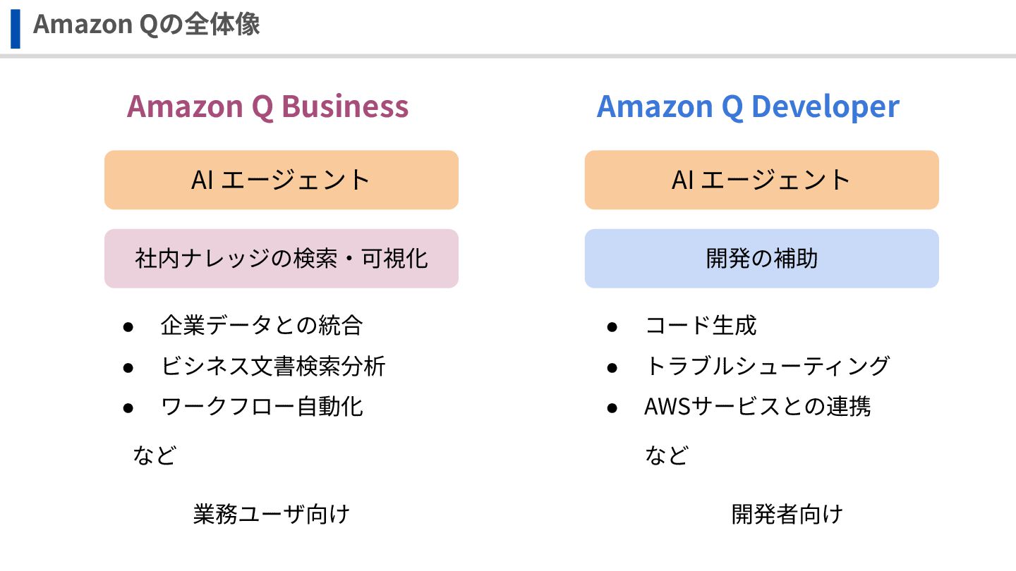 Amazon Qの全体像 Amazon Q Business Amazon Q Developer AI エージェント
