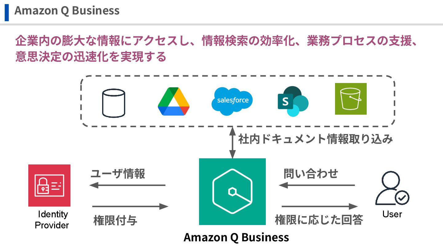 Amazon Q Business 企業内の膨⼤な情報にアクセスし、情報検索の効率化、業務プロセスの⽀援、 意思決定の迅速化を実現する User Identity Provider Amazon Q