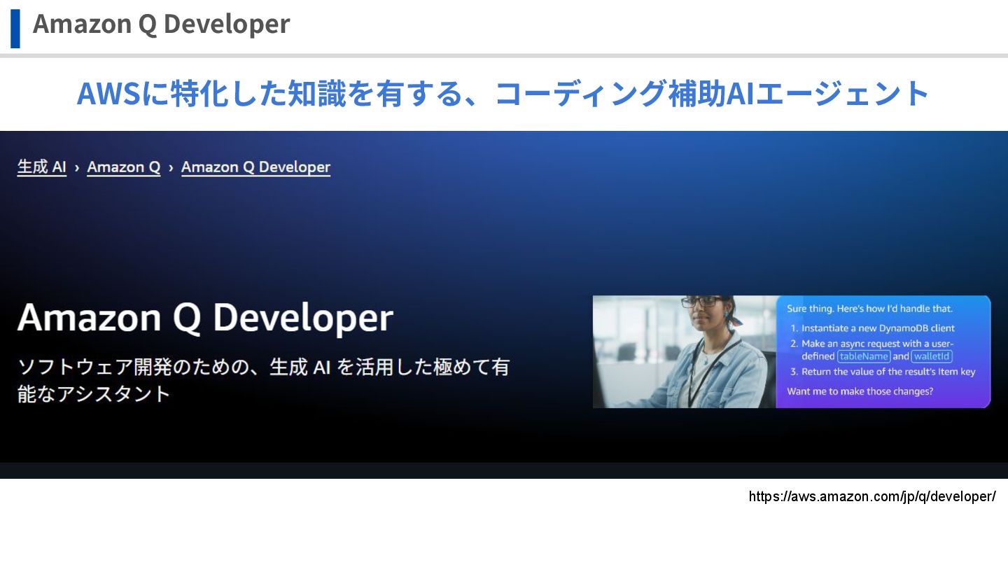 Amazon Q Developer AWSに特化した知識を有する、コーディング補助AIエージェント https://aws.amazon.com/jp/q/developer/