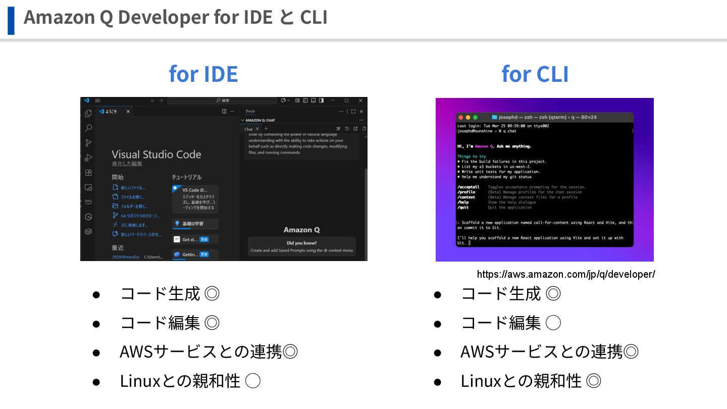Amazon Q Developer for IDE と CLI https://aws.amazon.com/jp/q/developer/ for CLI