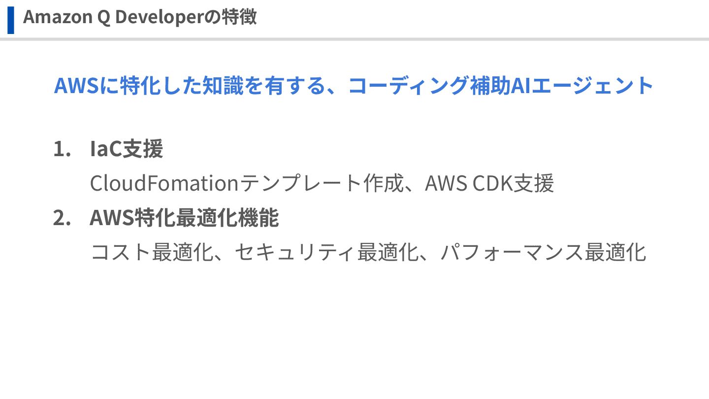 Amazon Q Developerの特徴 AWSに特化した知識を有する、コーディング補助AIエージェント 1. IaC⽀援 CloudFomationテンプレート作成、AWS CDK⽀援 2. AWS特化最適化機能