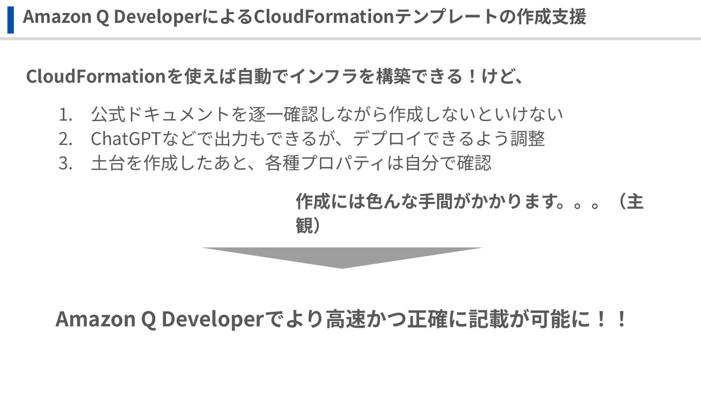 Amazon Q DeveloperによるCloudFormationテンプレートの作成⽀援 CloudFormationを使えば⾃動でインフラを構築できる!けど、 1. 公式ドキュメントを逐⼀確認しながら作成しないといけない 2. ChatGPTなどで出⼒もできるが、デプロイできるよう調整 3. ⼟台を作成したあと、各種プロパティは⾃分で確認