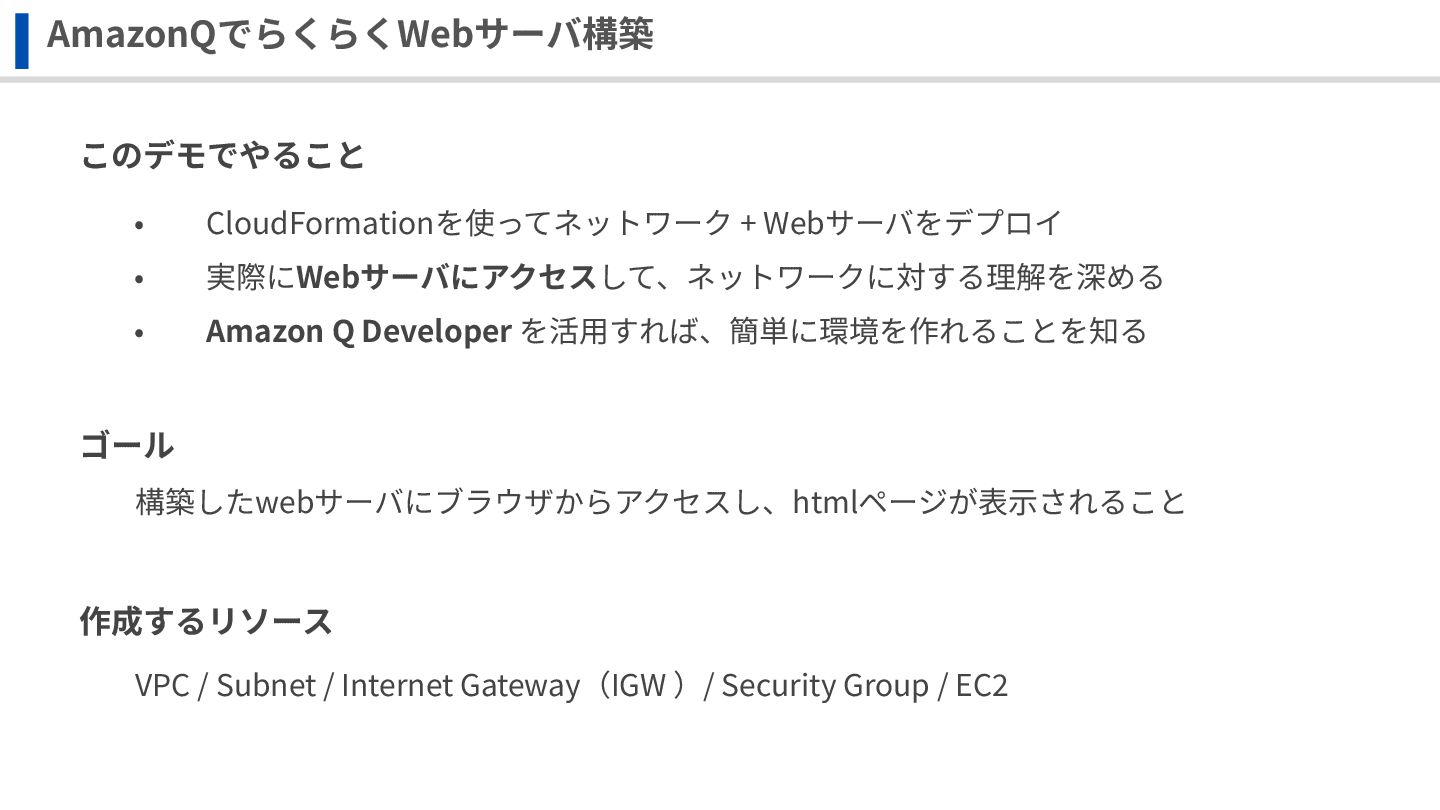 AmazonQでらくらくWebサーバ構築 • CloudFormationを使ってネットワーク + Webサーバをデプロイ • 実際にWebサーバにアクセスして、ネットワークに対する理解を深める • Amazon Q