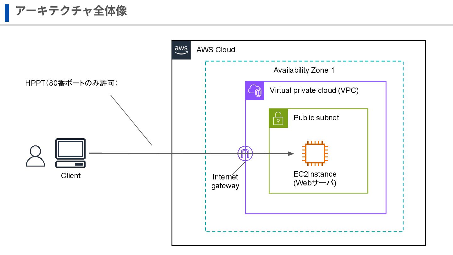Public subnet EC2Instance (Webサーバ) Internet gateway Client HPPT(80番ポートのみ許可)