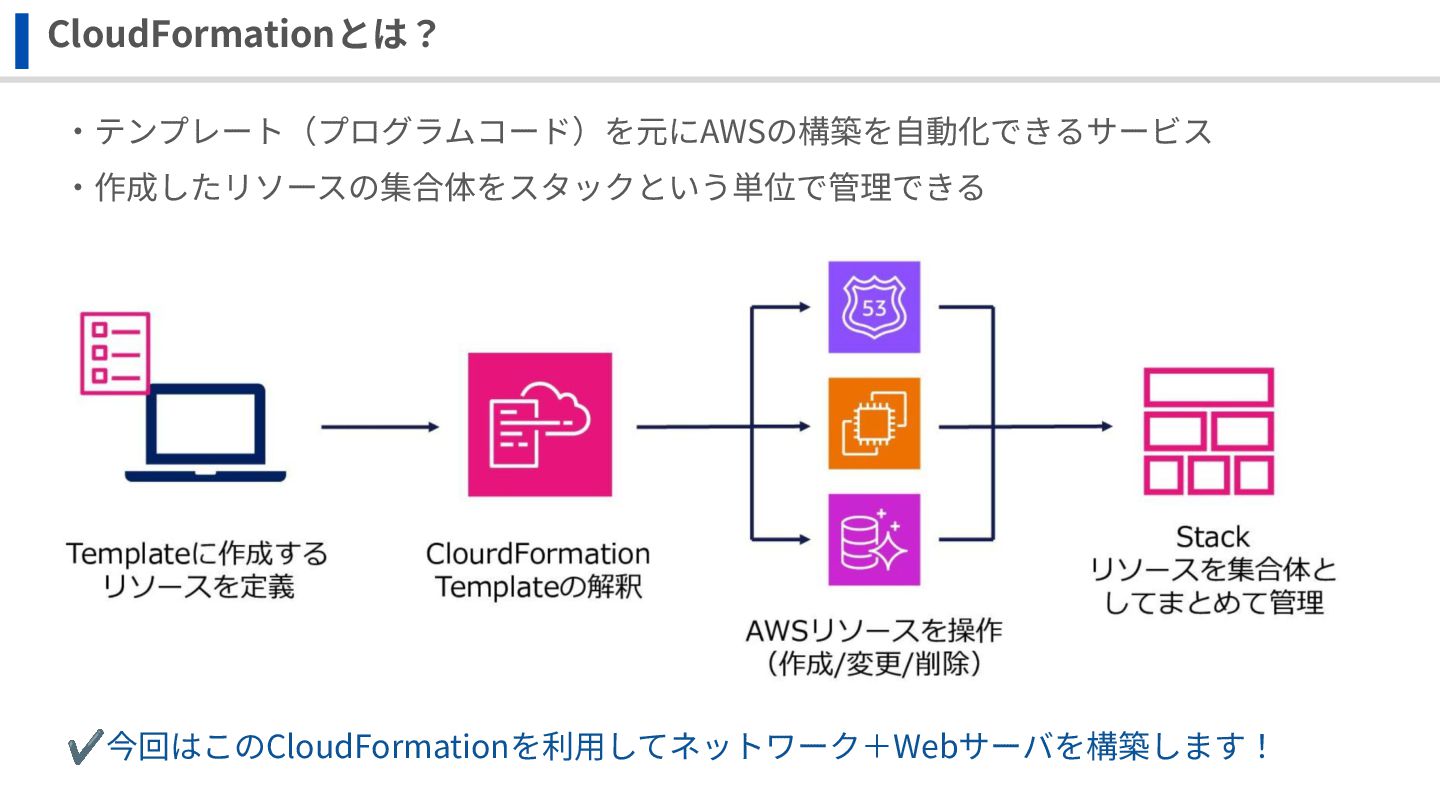 CloudFormationとは? ‧テンプレート(プログラムコード)を元にAWSの構築を⾃動化できるサービス ‧作成したリソースの集合体をスタックという単位で管理できる ✔今回はこのCloudFormationを利⽤してネットワーク+Webサーバを構築します!
