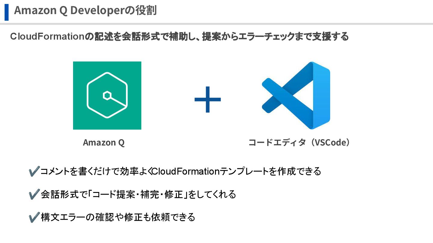 Amazon Q Developerの役割 CloudFormationの記述を会話形式で補助し、提案からエラーチェックまで支援する Amazon Q ✔コメントを書くだけで効率よくCloudFormationテンプレートを作成できる ✔会話形式で「コード提案・補完・修正」をしてくれる ✔構文エラーの確認や修正も依頼できる コードエディタ(VSCode)