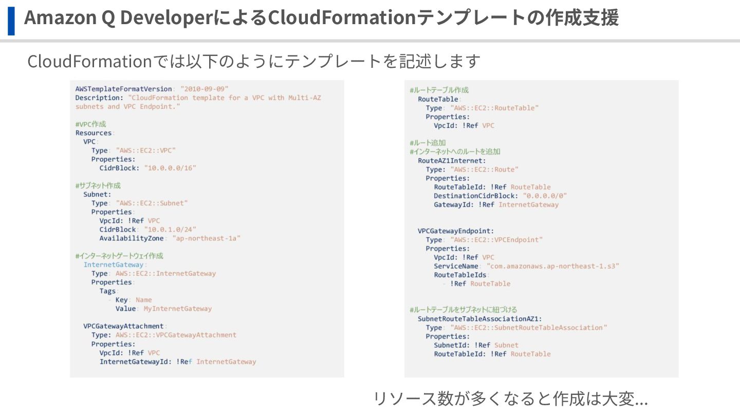 Amazon Q DeveloperによるCloudFormationテンプレートの作成⽀援 CloudFormationでは以下のようにテンプレートを記述します リソース数が多くなると作成は⼤変...