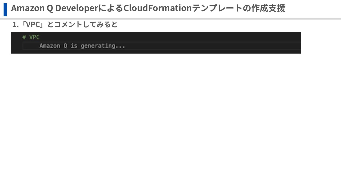 Amazon Q DeveloperによるCloudFormationテンプレートの作成⽀援 1.「VPC」とコメントしてみると 2.⽣成した候補が表⽰される。(Tab keyで確定できる)
