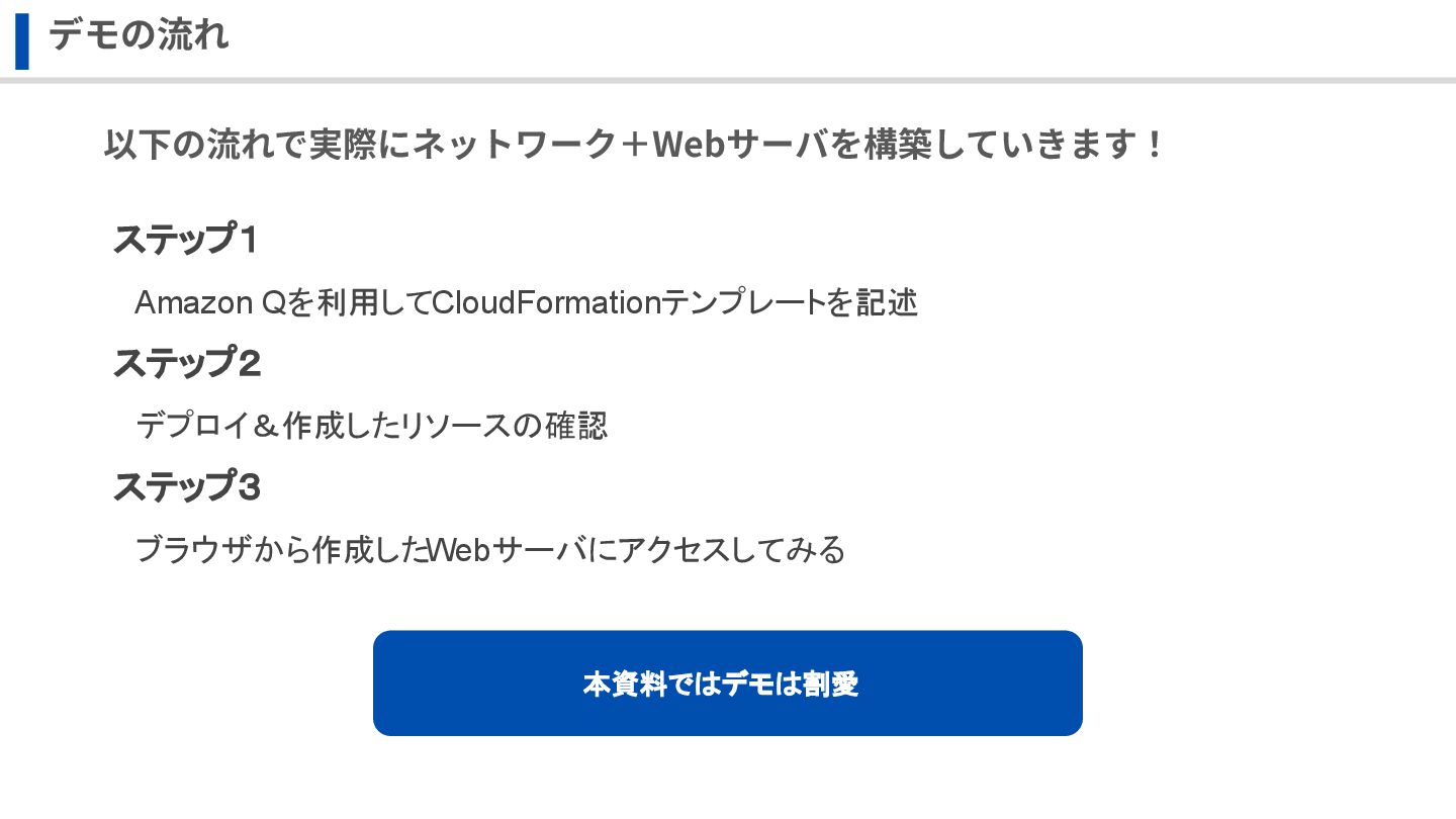 デモの流れ ステップ1 Amazon Qを利用してCloudFormationテンプレートを記述 ステップ2 デプロイ&作成したリソースの確認 ステップ3 ブラウザから作成したWebサーバにアクセスしてみる 以下の流れで実際にネットワーク+Webサーバを構築していきます! 本資料ではデモは割愛