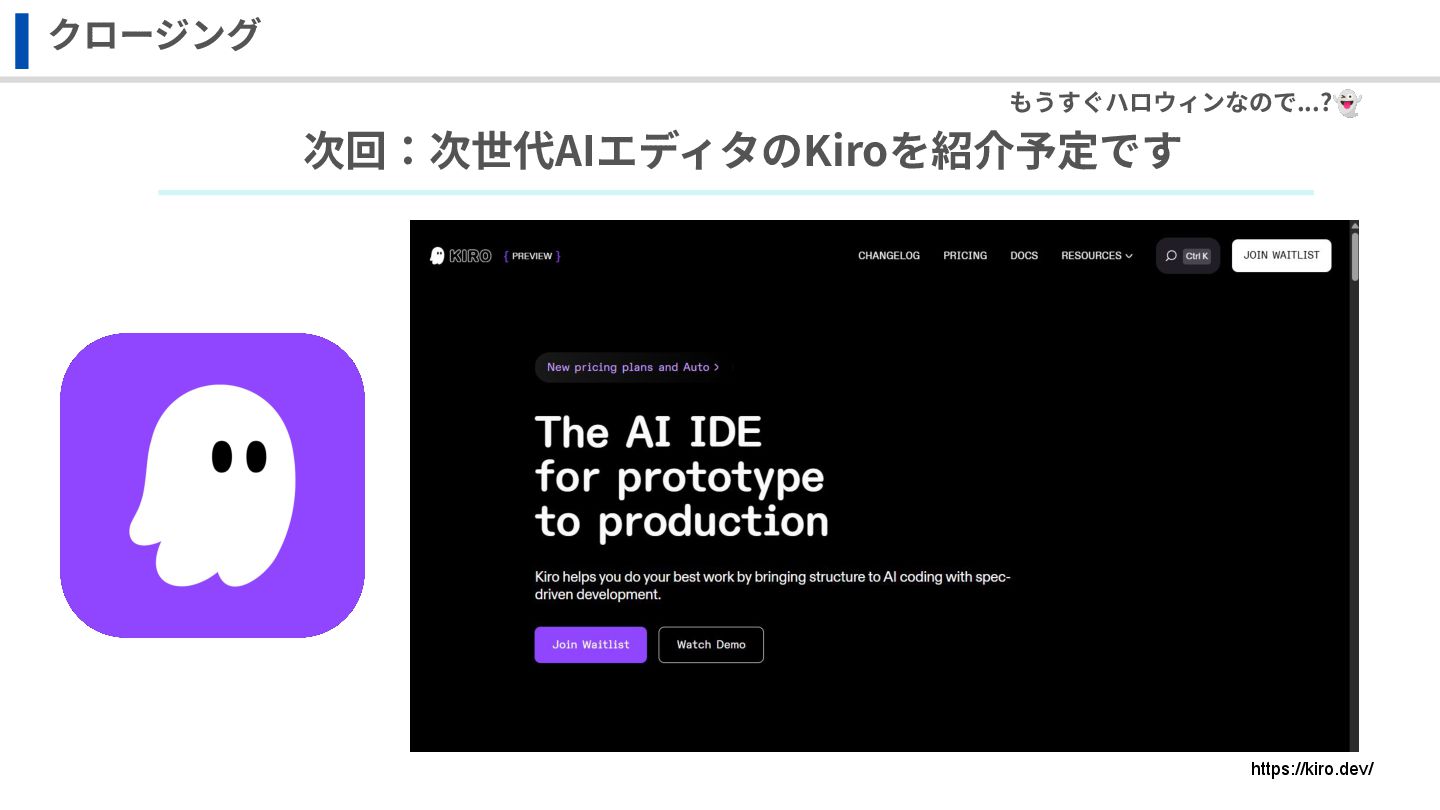 クロージング https://kiro.dev/ 次回:次世代AIエディタのKiroを紹介予定です もうすぐハロウィンなので...?👻