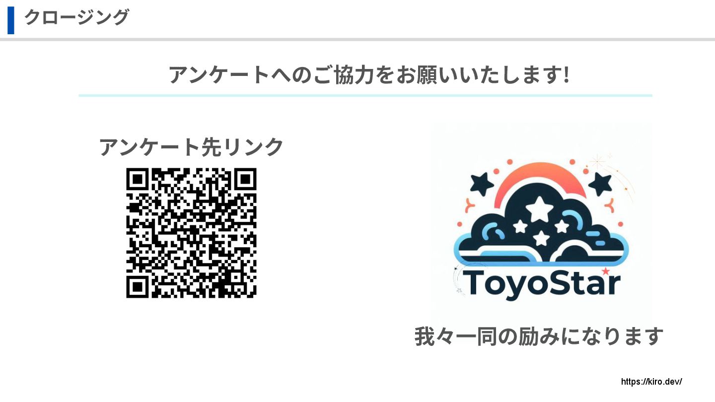 クロージング https://kiro.dev/ アンケートへのご協⼒をお願いいたします! 我々⼀同の励みになります アンケート先リンク