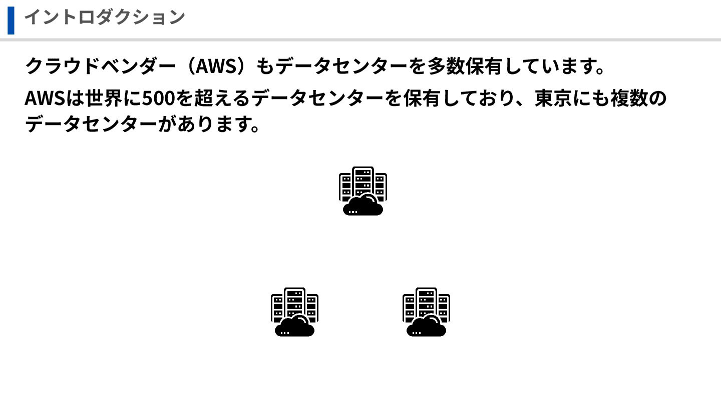 イントロダクション クラウドベンダー(AWS)もデータセンターを多数保有しています。 AWSは世界に500を超えるデータセンターを保有しており、東京にも複数の データセンターがあります。