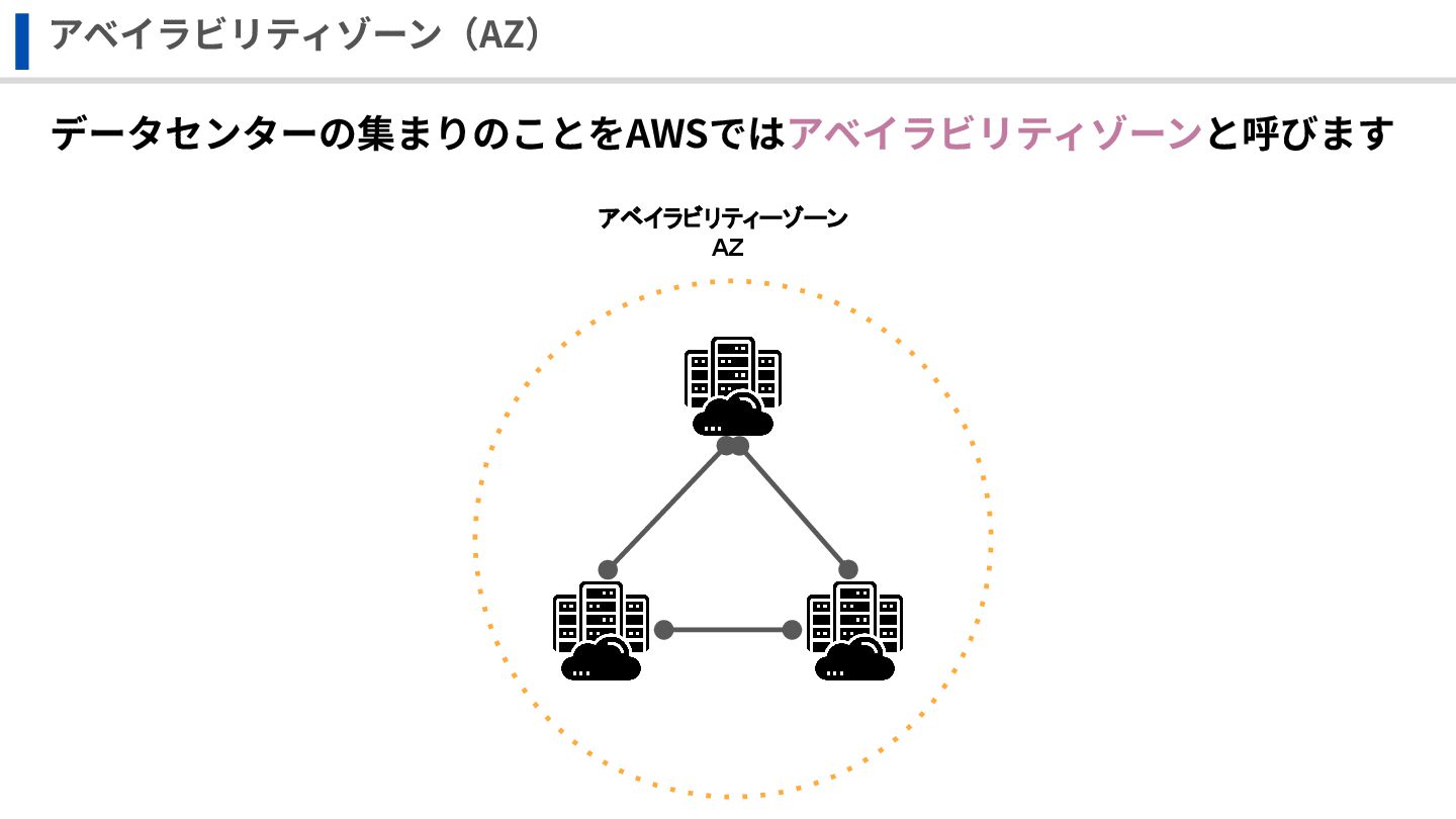 アベイラビリティゾーン(AZ) データセンターの集まりのことをAWSではアベイラビリティゾーンと呼びます アベイラビリティーゾーン AZ