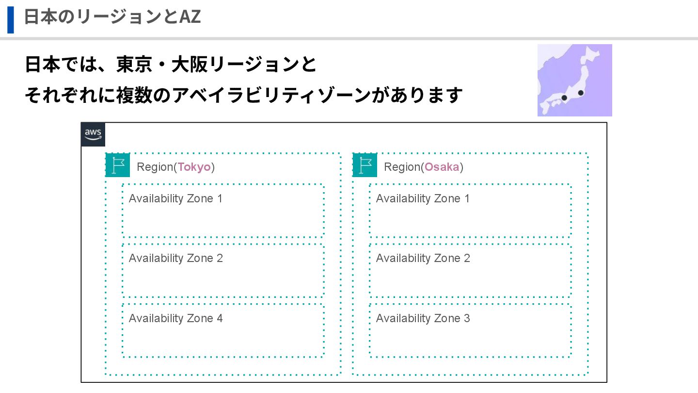 ⽇本のリージョンとAZ ⽇本では、東京‧⼤阪リージョンと それぞれに複数のアベイラビリティゾーンがあります Region(Tokyo) Region(Osaka) Availability Zone 1 Availability Zone