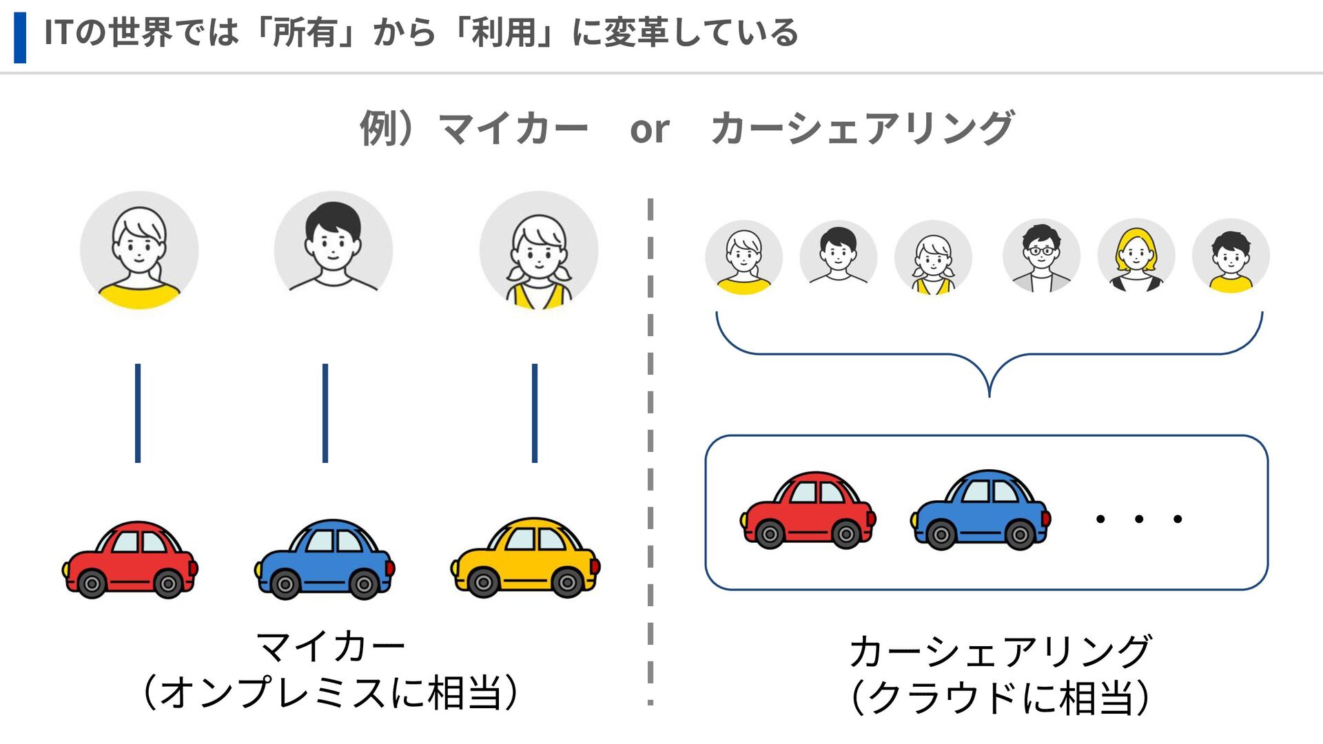 ITの世界では「所有」から「利⽤」に変⾰している 例)マイカー or カーシェアリング ‧‧‧ カーシェアリング (クラウドに相当) マイカー (オンプレミスに相当)