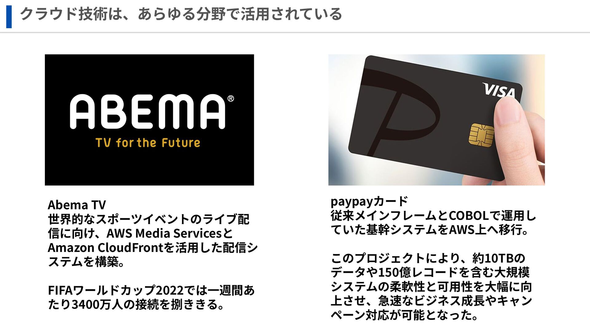 FIFAワールドカップ2022では⼀週間あ たり3400万⼈の接続を捌ききる。 paypayカード 従来メインフレームとCOBOLで運⽤し ていた基幹システムをAWS上へ移⾏。 このプロジェクトにより、約10TBの データや150億レコードを含む⼤規模 システムの柔軟性と可⽤性を⼤幅に向 上させ、急速なビジネス成⻑やキャン ペーン対応が可能となった。