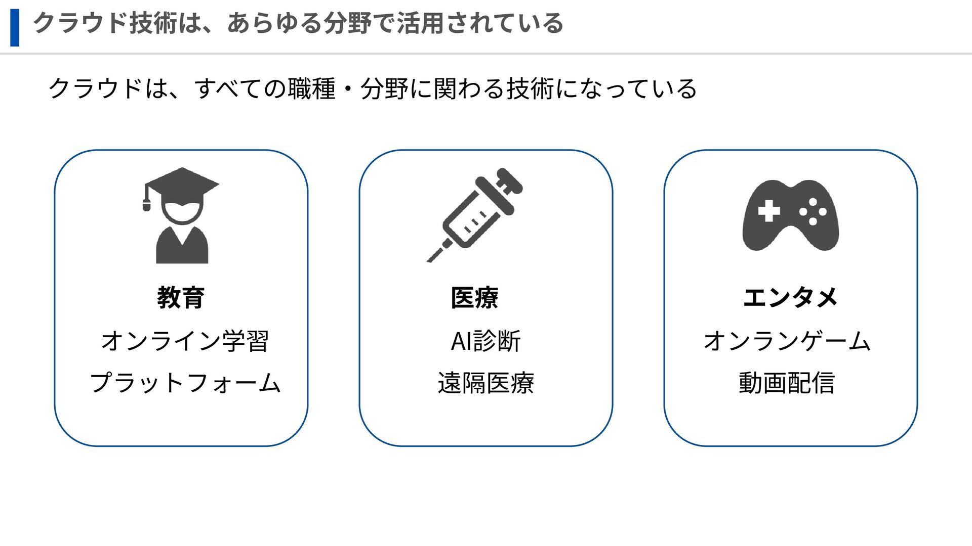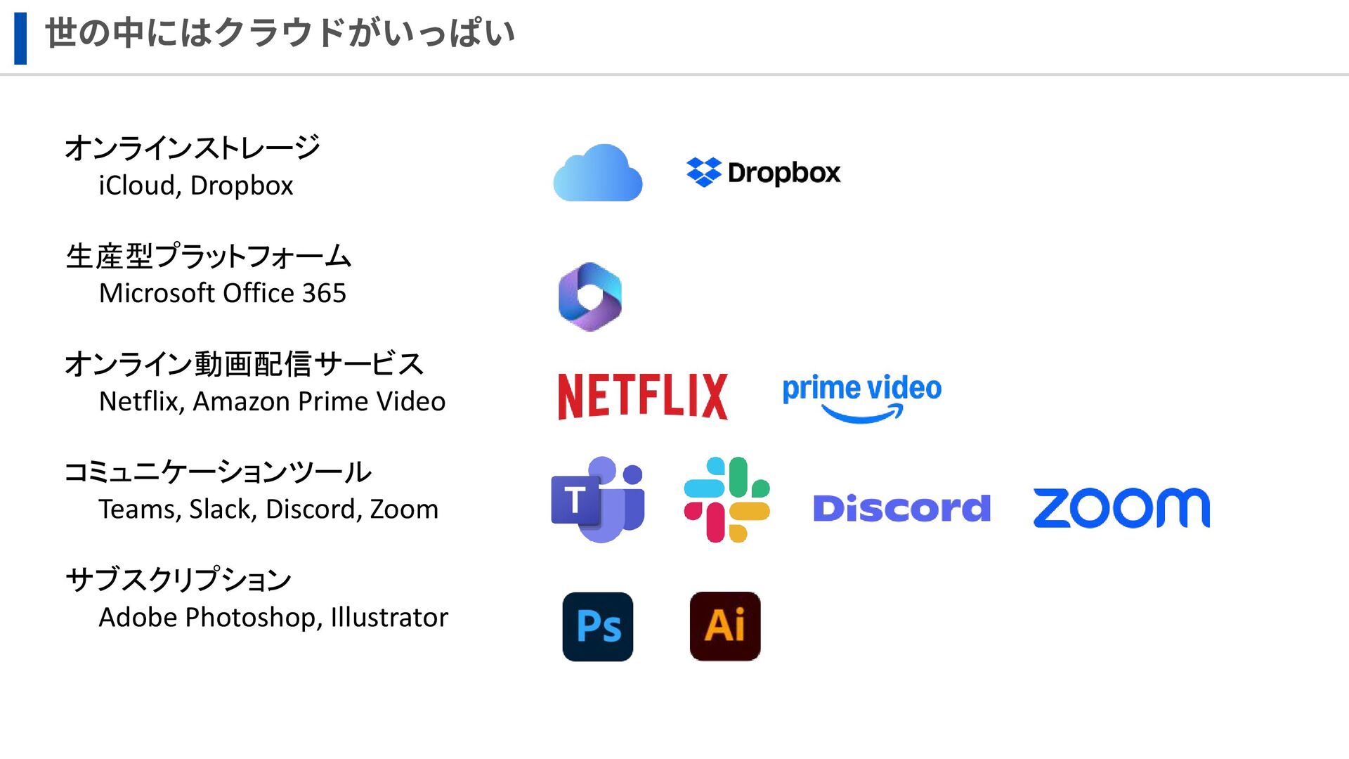 ITの世界では「所有」から「利⽤」に変⾰している など 自社でサーバを 「所有」する セットアップやメン テナンスが必要 ネットワーク越し でサービス「利 用」するだけ クラウド事業者