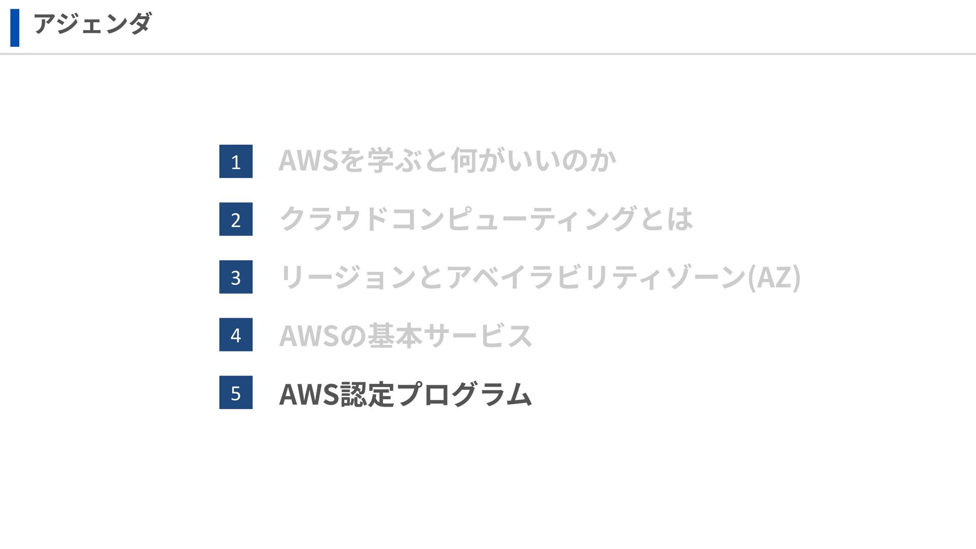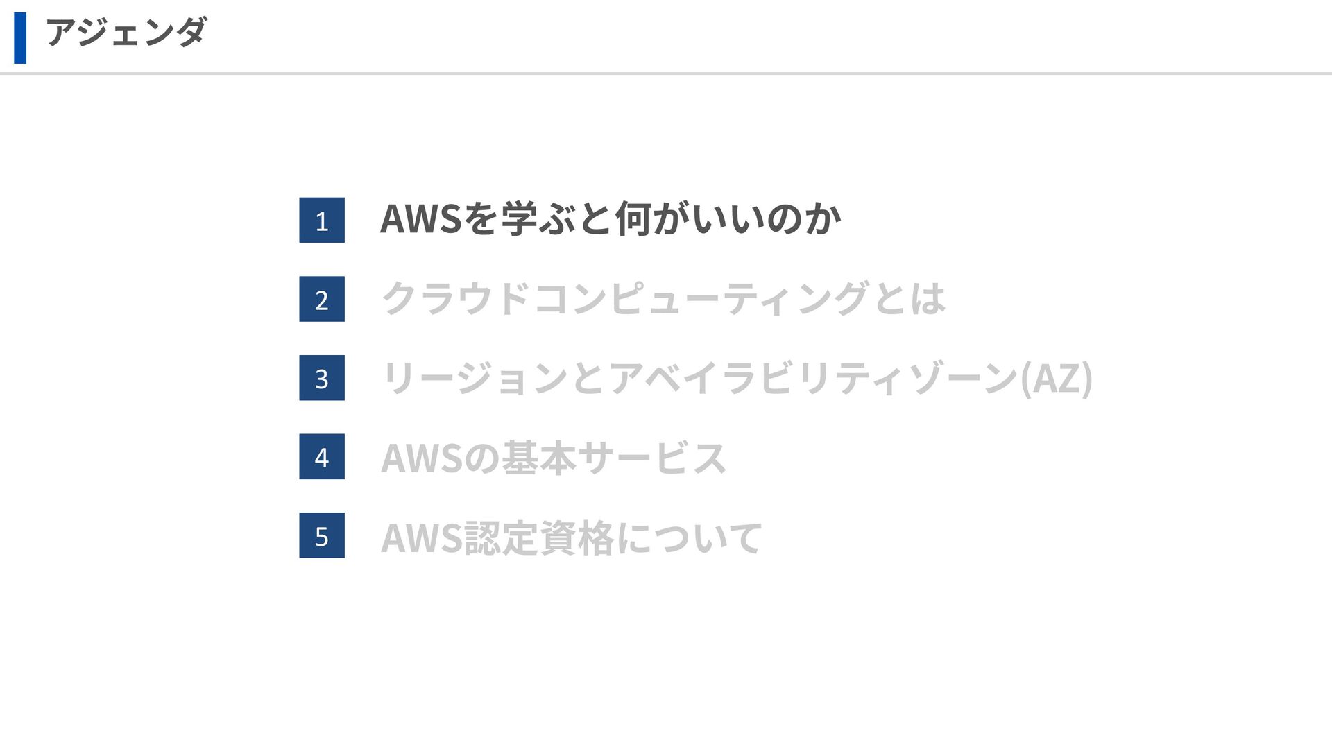 AWSを学ぶと何がいいのか クラウドコンピューティングとは クロージング リージョンとアベイラビリティゾーン(AZ) AWSの基本サービス AWS認定資格について 1 2 3 4