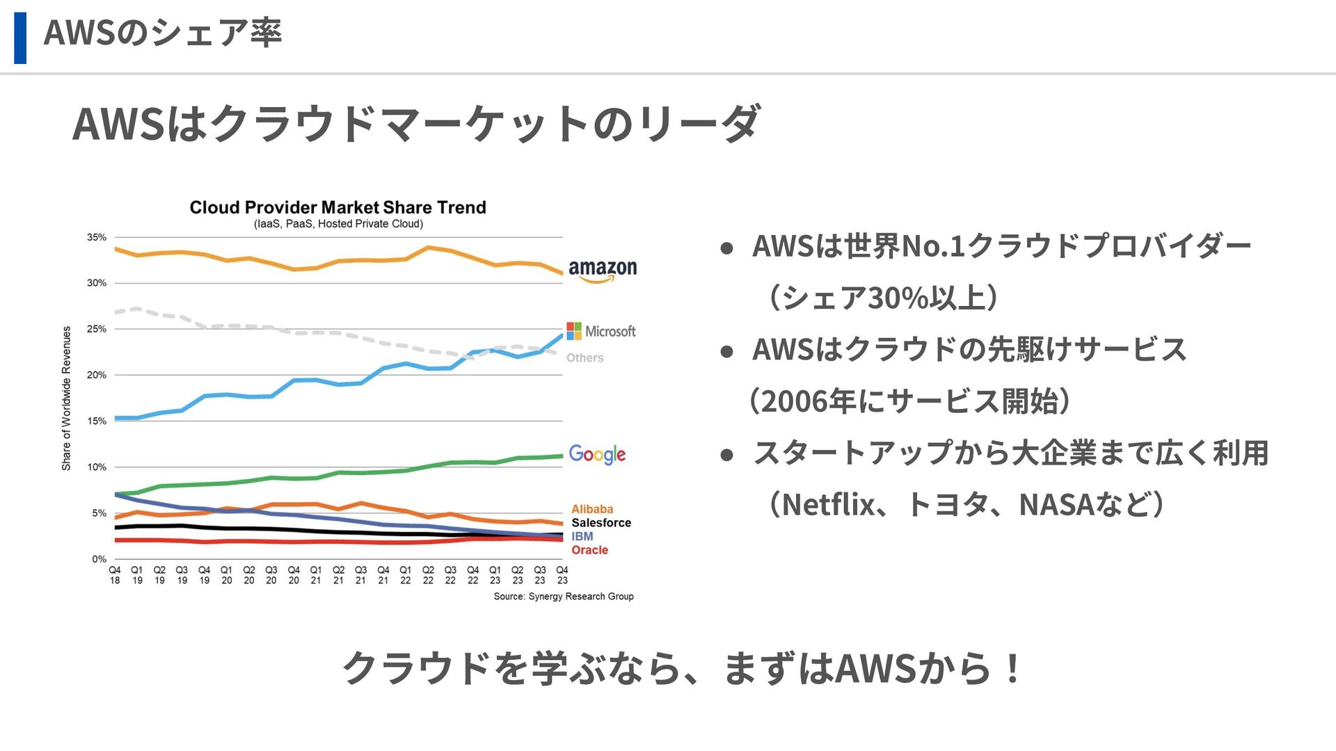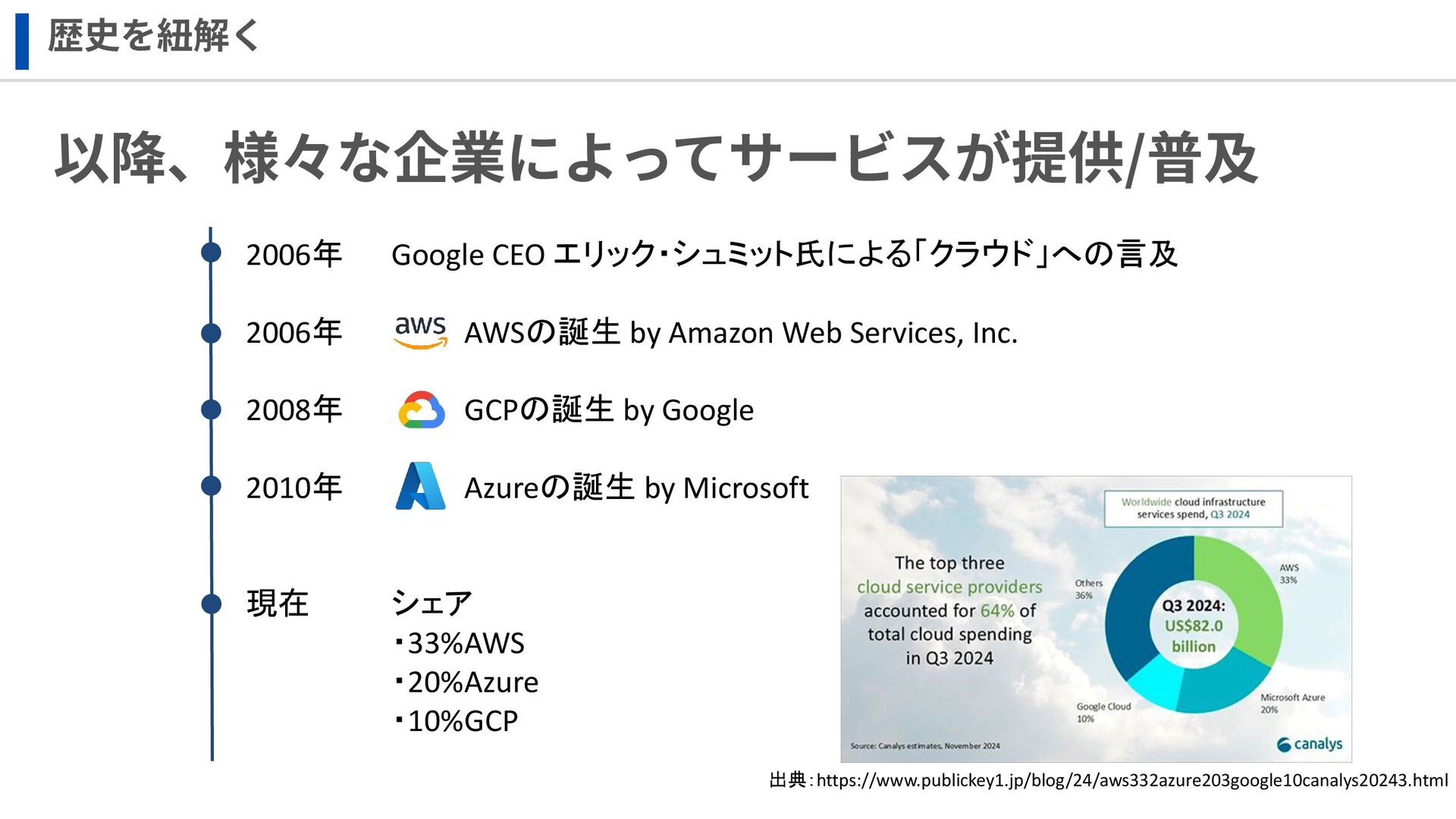 Inc. 2008年 GCPの誕生 by Google 2010年 Azureの誕生 by Microsoft 現在 シェア ・33%AWS ・20%Azure ・10%GCP 歴史を紐解く 以降、様々な企業によってサービスが提供/普及 出典:https://www.publickey1.jp/blog/24/aws332azure203google10canalys20243.html